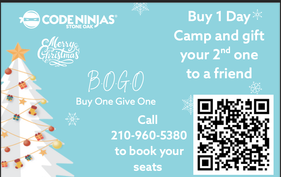 This holiday season, share the fun! Buy 1 Day Camp at Code Ninjas Stone Oak and gift the 2nd camp spot to a friend — FREE. Perfect for kids who love building, coding, and creating together. 📞 Call...