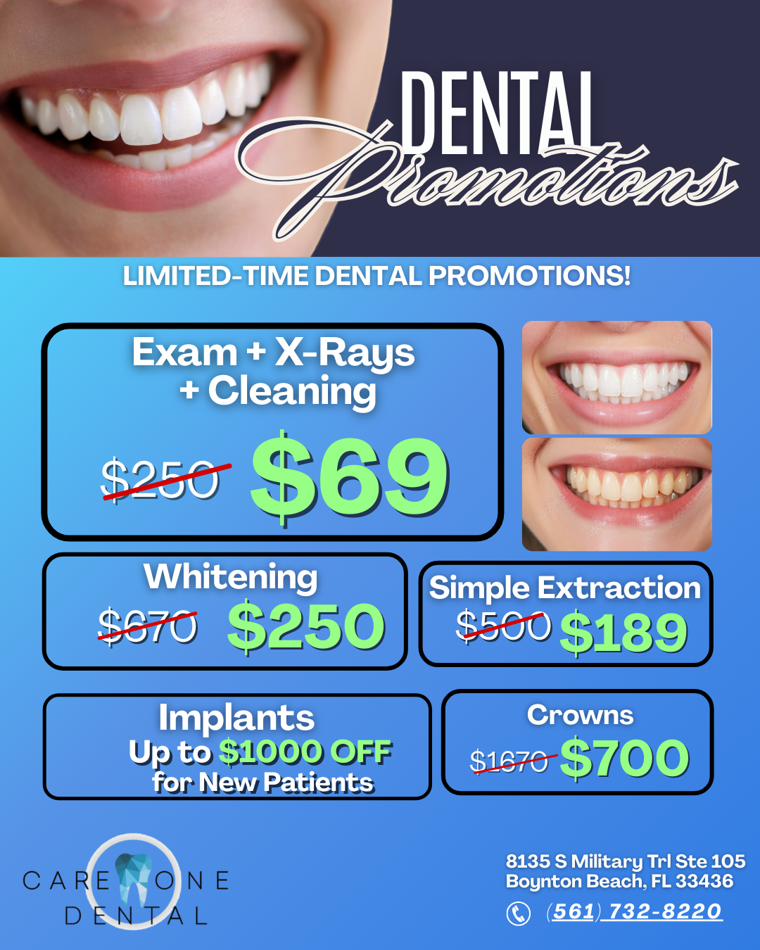 Hello Florida! Have you been putting off your dentist visit because of fear or cost? At Care One Dental, weβre launching a special promo with up to 50% OFF on the most important treatments for your...