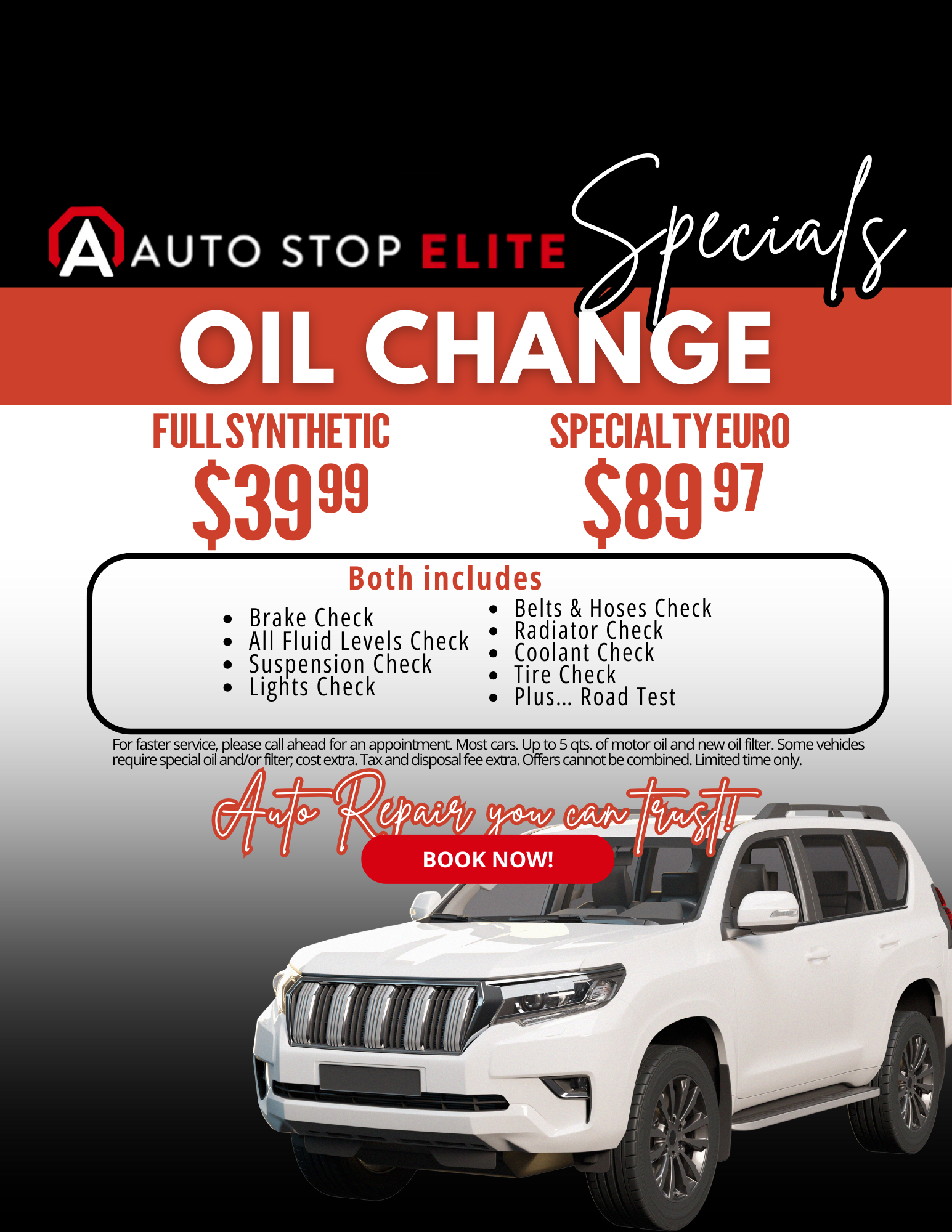 At Auto Stop Elite, weβre committed to giving your vehicle the premium care it deserves with our full synthetic and specialty euro oil change specials. Every service comes with a detailed multi-point...