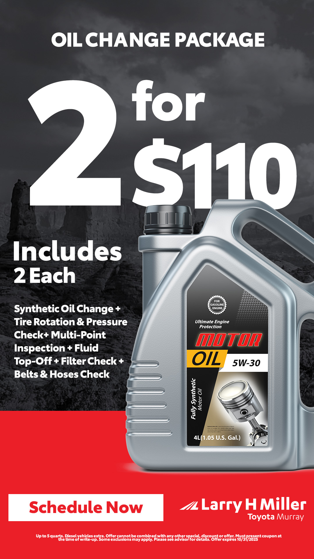 WAIT, WHAT?! 2 Full Synthetic Oil Changes for $110? Get tire rotation, pressure check & multi-point inspection too! Schedule now and save big! Tap to redeem this crazy offer!