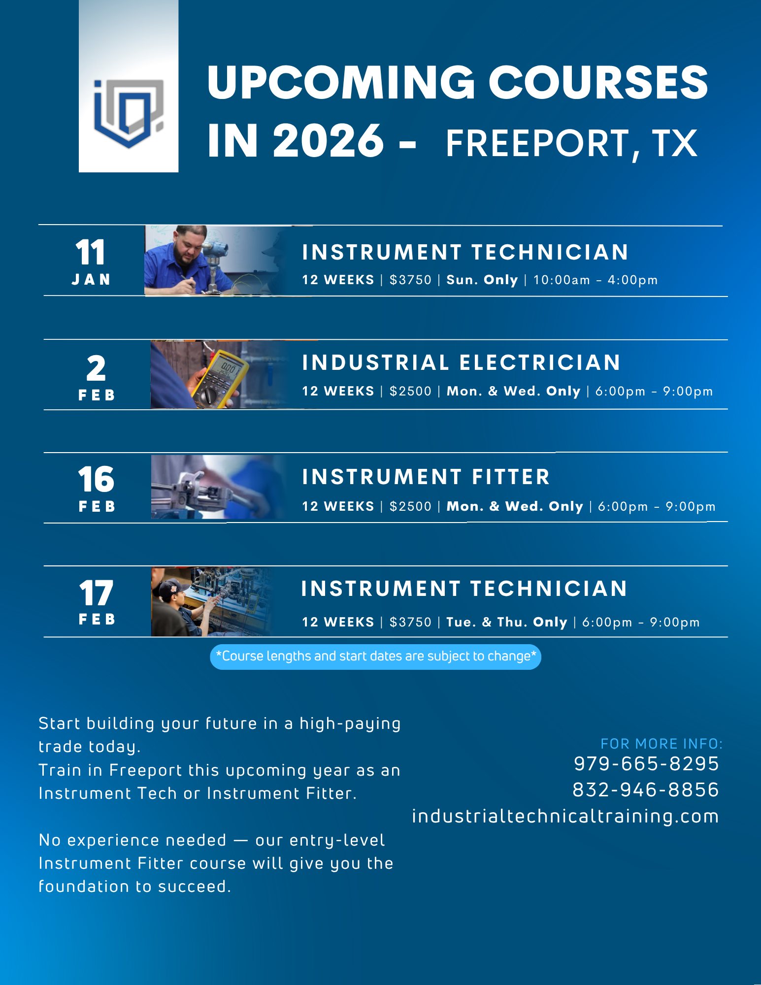 Our upcoming courses in Freeport, TX are now open for enrollment. Whether you’re looking to begin your journey or advance in the trades, our hands-on training programs will help you build the skills...