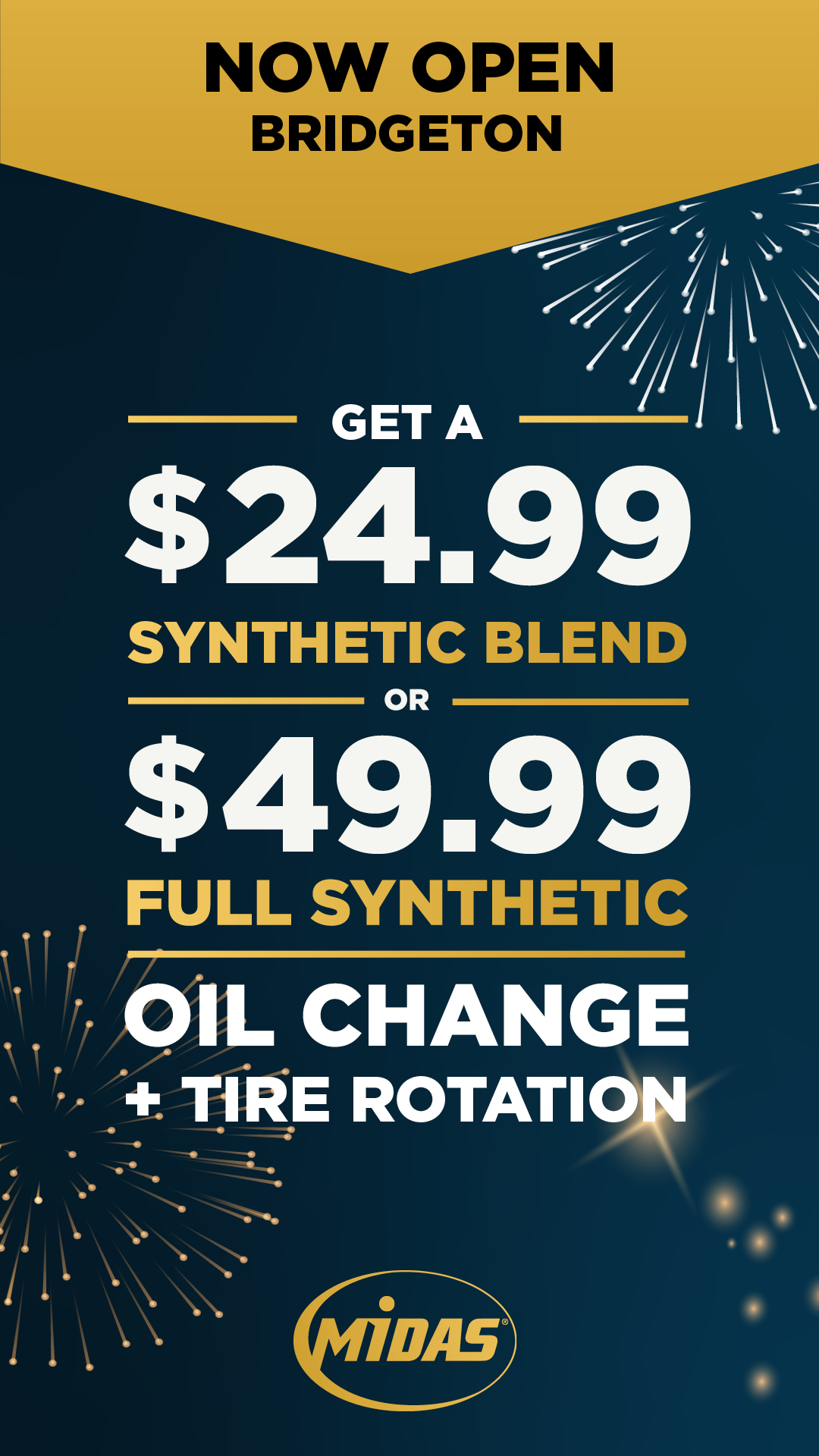 Welcome Midas to the neighborhood. Stop by your new local Midas for a $24.99 Synthetic Blend Oil Change.