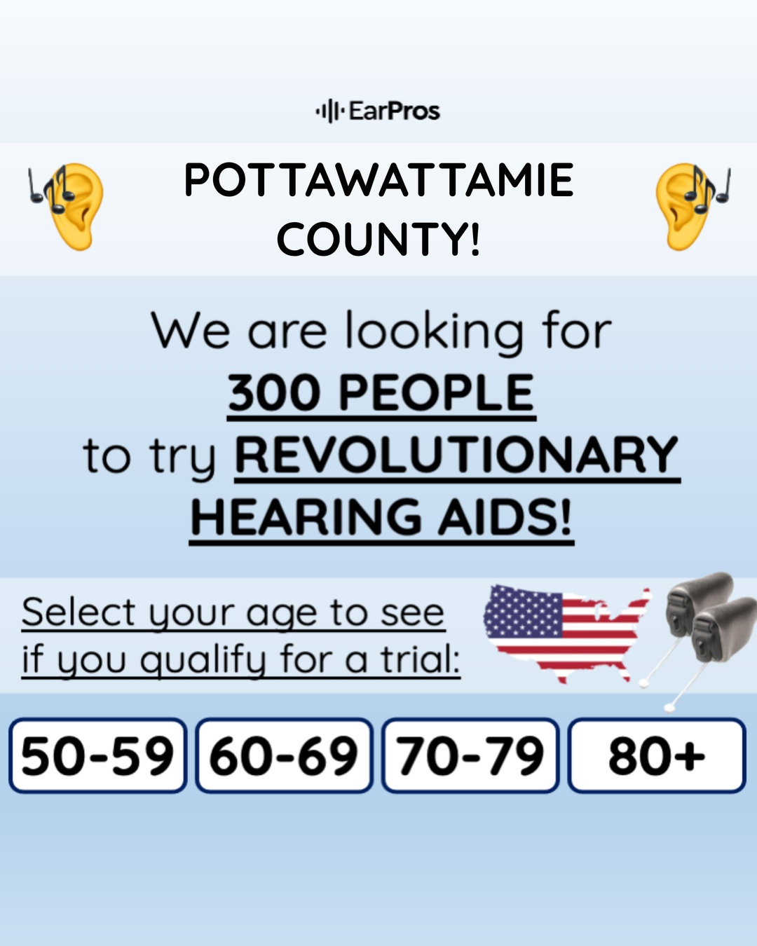 π’ POTTAWATTAMIE COUNTY! We are looking for 300 People aged 50 or more to try New, Revolutionary Hearing Aids! β Almost Invisible and Discreet β Affordable and Easy to Manage β Perfectly Fit in your...