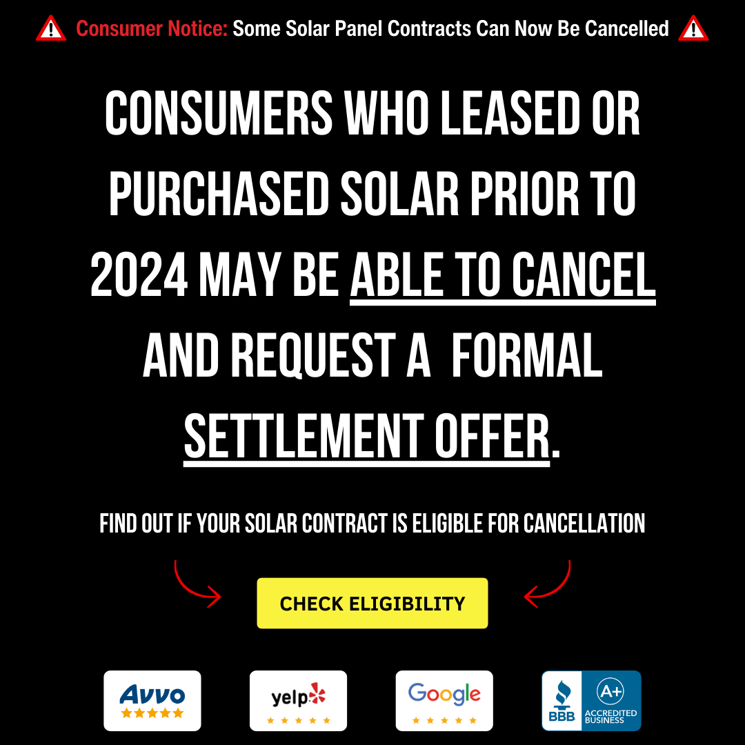 Solar Panel Users: Ever wish you hadn't purchased or leased your solar panels? You might be entitled to cancel your solar lease or purchase contract. Click here to find out.