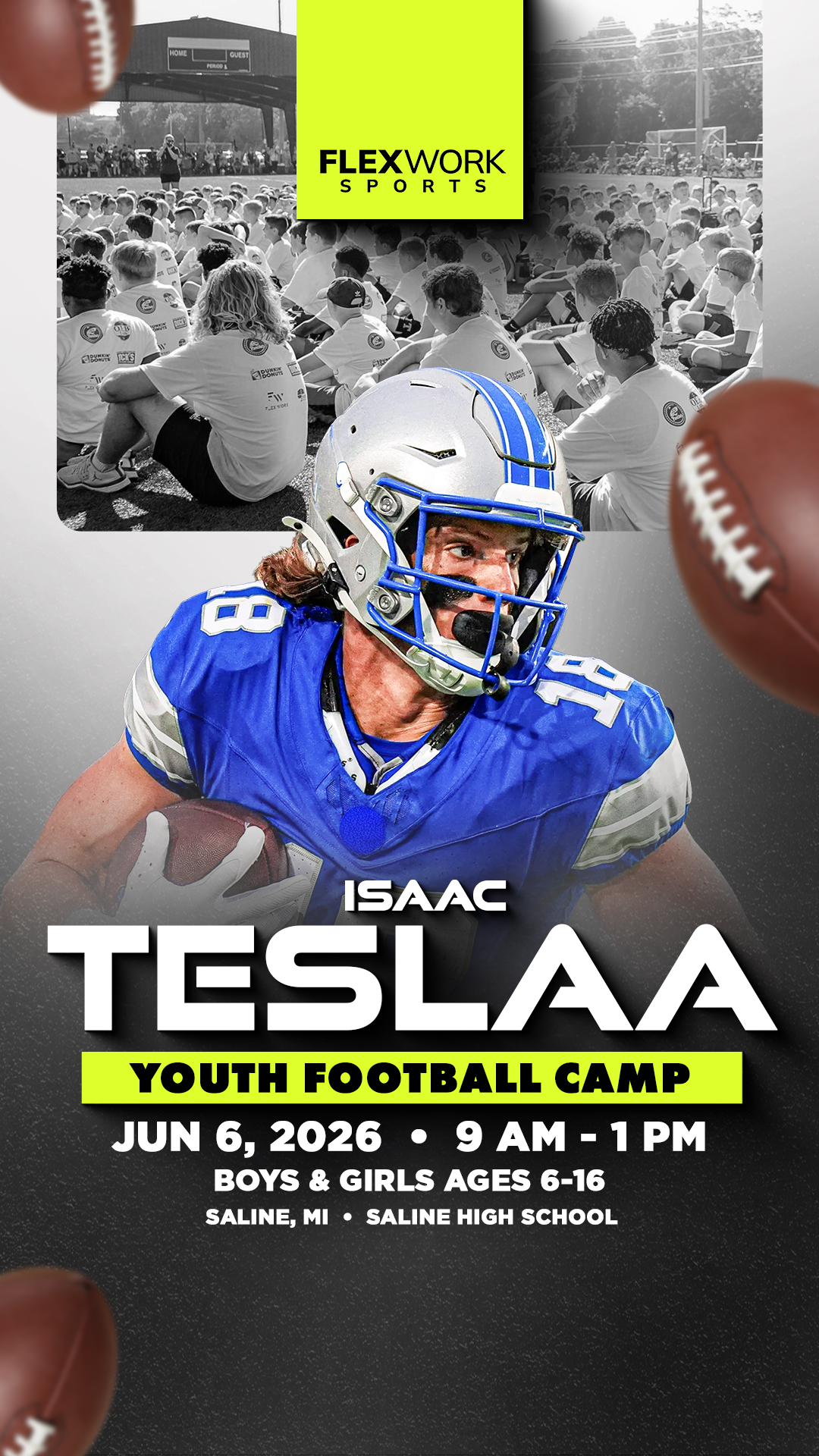 Excited to announce Isaac TeSlaa will be in Saline to host a youth football camp! Athletes ages 6-16 will ⨠Learn skills from TeSlaa šø Get a pic with the star š Get Swag Join us on Saturday, June...