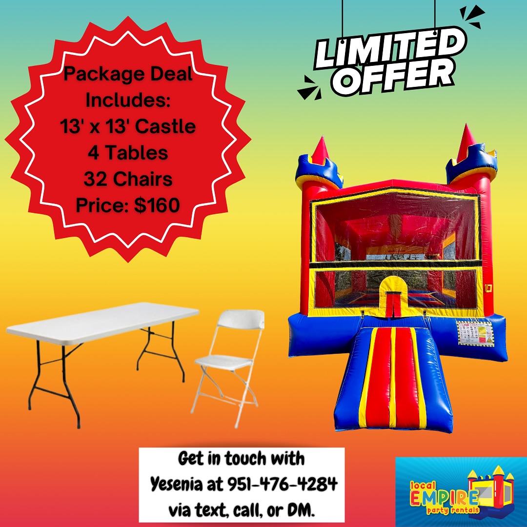 🎉 Limited Time Offer! Reserve our 13x13 Jumper package — includes 4 tables & 32 chairs, perfect for your upcoming holiday parties! 🥳 Plan ahead and secure your date today. Serving the Inland Empire...