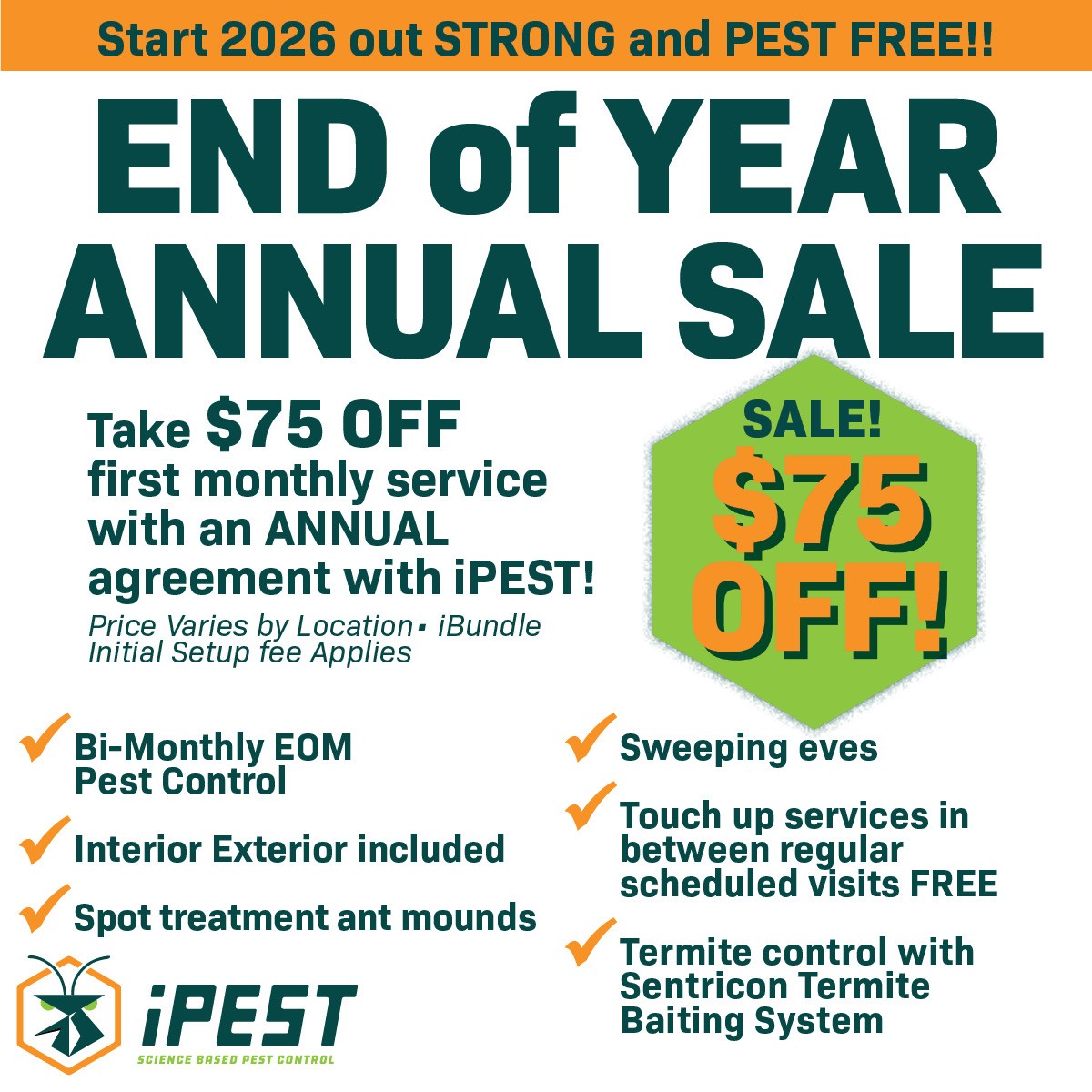 Our END OF YEAR ANNUAL SALE is HERE! ππ·οΈ Letβs start 2026 STRONG and PEST FREE with iPEST! For a limited time, get $75 OFF your first monthly service with an ANNUAL contract from iPest! β π...