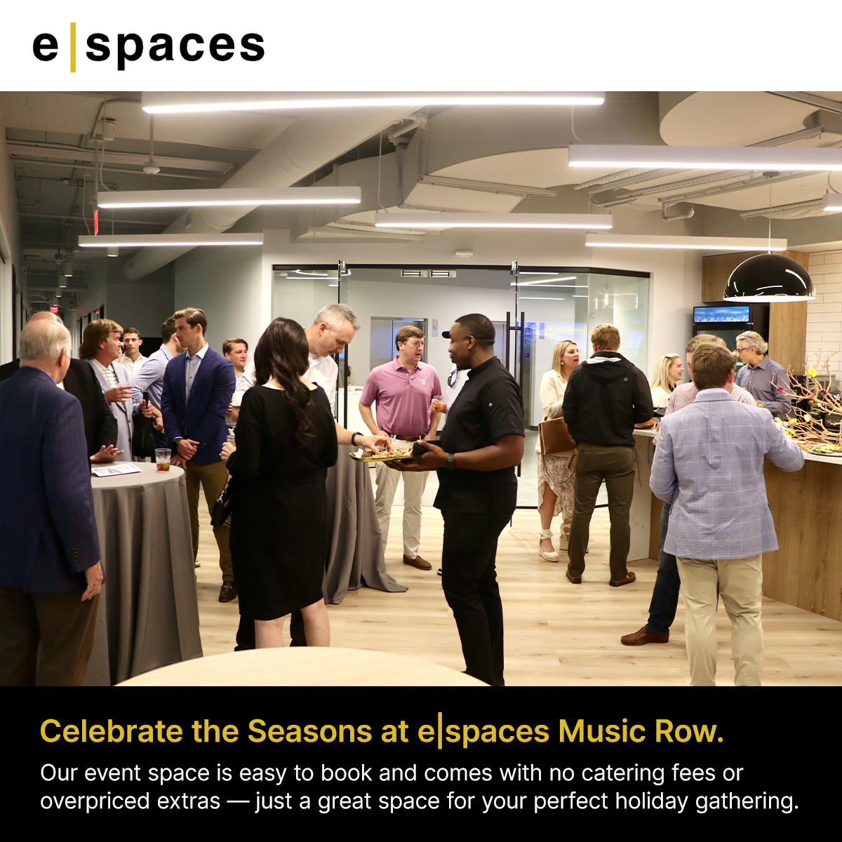 Host your holiday event with ease at e|spaces Music Row — no catering fees, no extras. And for a limited time, lease your next office free through 2025. Email [email protected] for details.