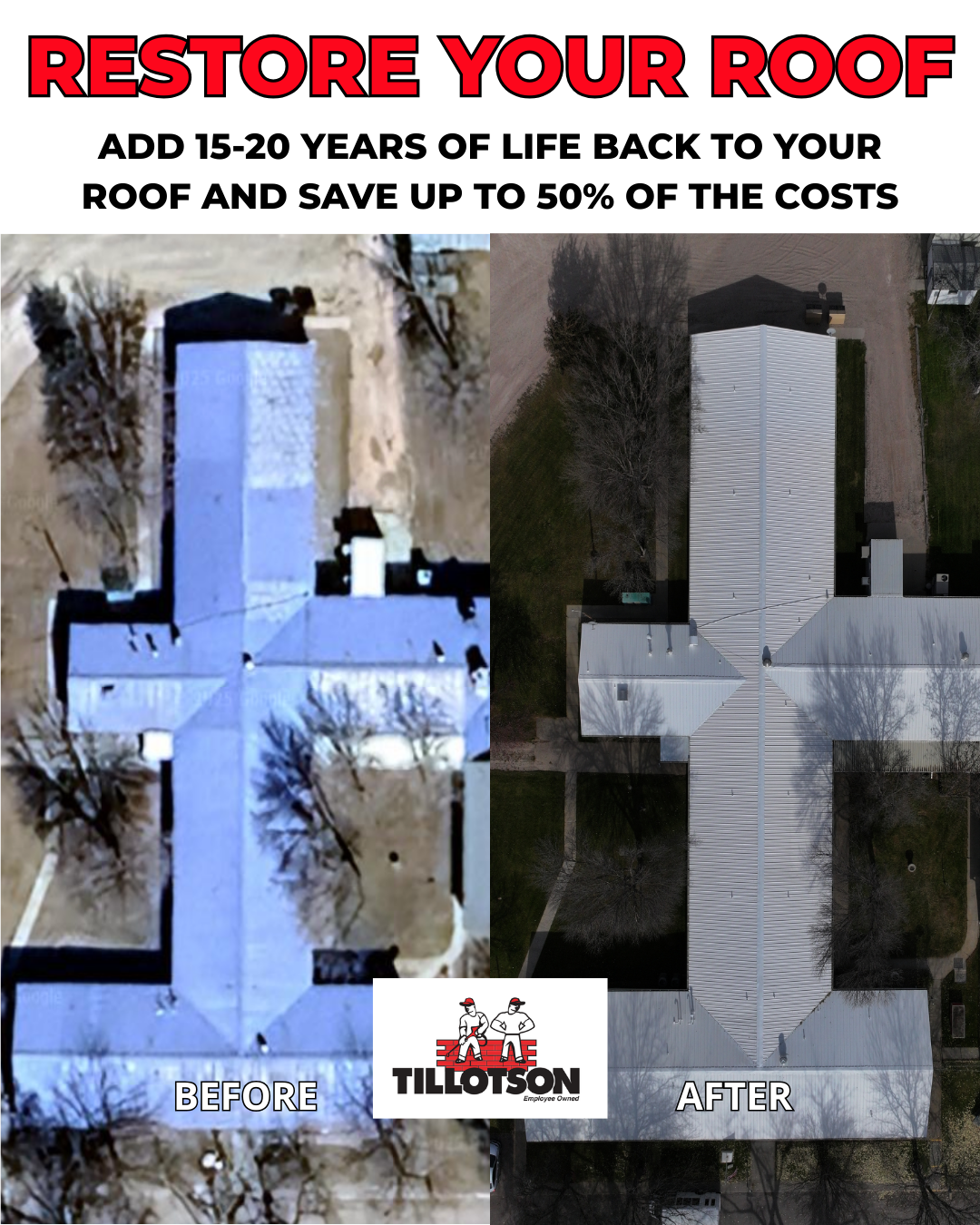 🚨Nebraska commercial building owners, look at the difference a real restoration makes. 👇 Tillotson’s spray-applied systems add 15–20 years of life back to your roof for a fraction of replacement...