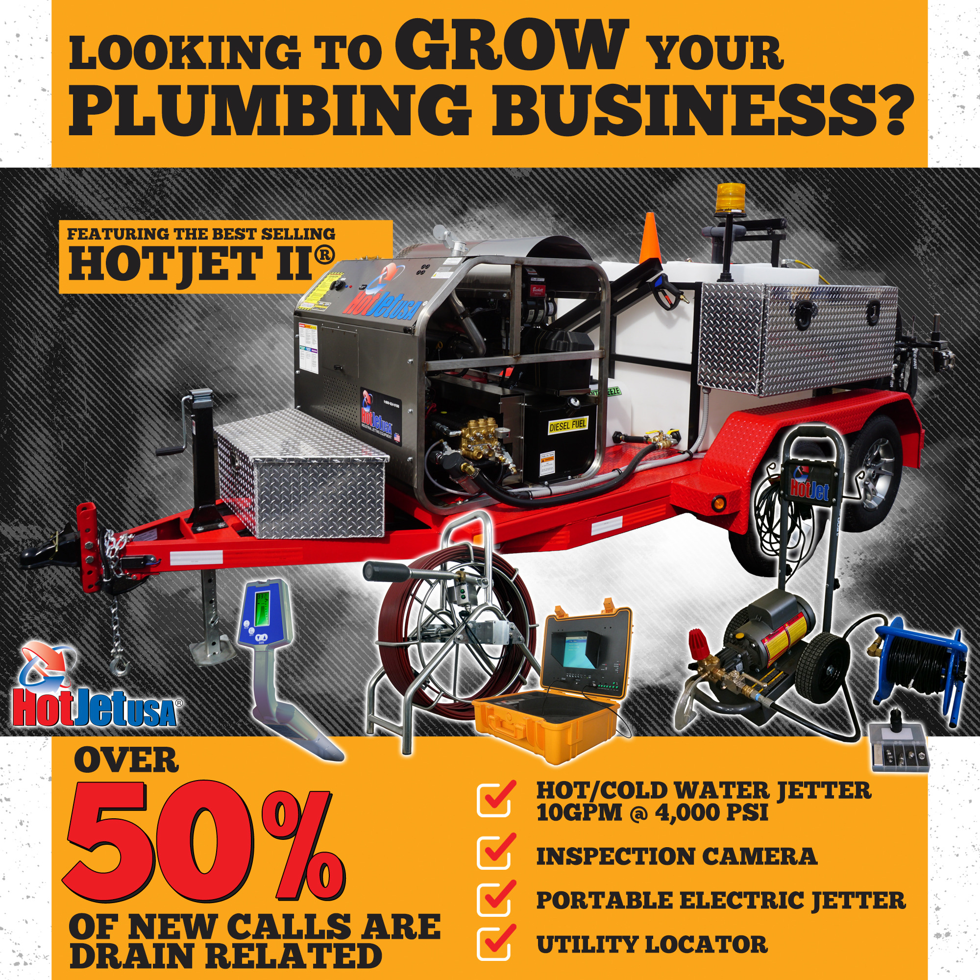 Looking to GROW your PLUMBING BUSINESS? The ULTIMATE DRAIN CLEANING BUSINESS PACKAGE includes: • Best Selling HotJet II® Trailer Jetter featuring 10GPM @ 4,000 PSI. Runs hot OR cold water, cleans...