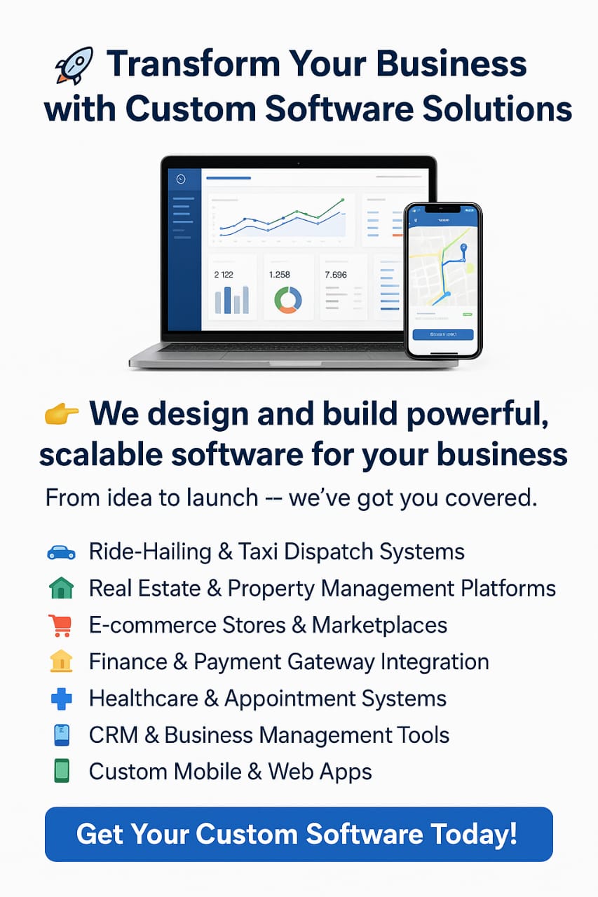 [5:02 pm, 23/09/2025] Software Solutions: Looking to scale your business with technology? We design and build high-quality custom software tailored to your needs. Whether you need a ride-hailing app,...