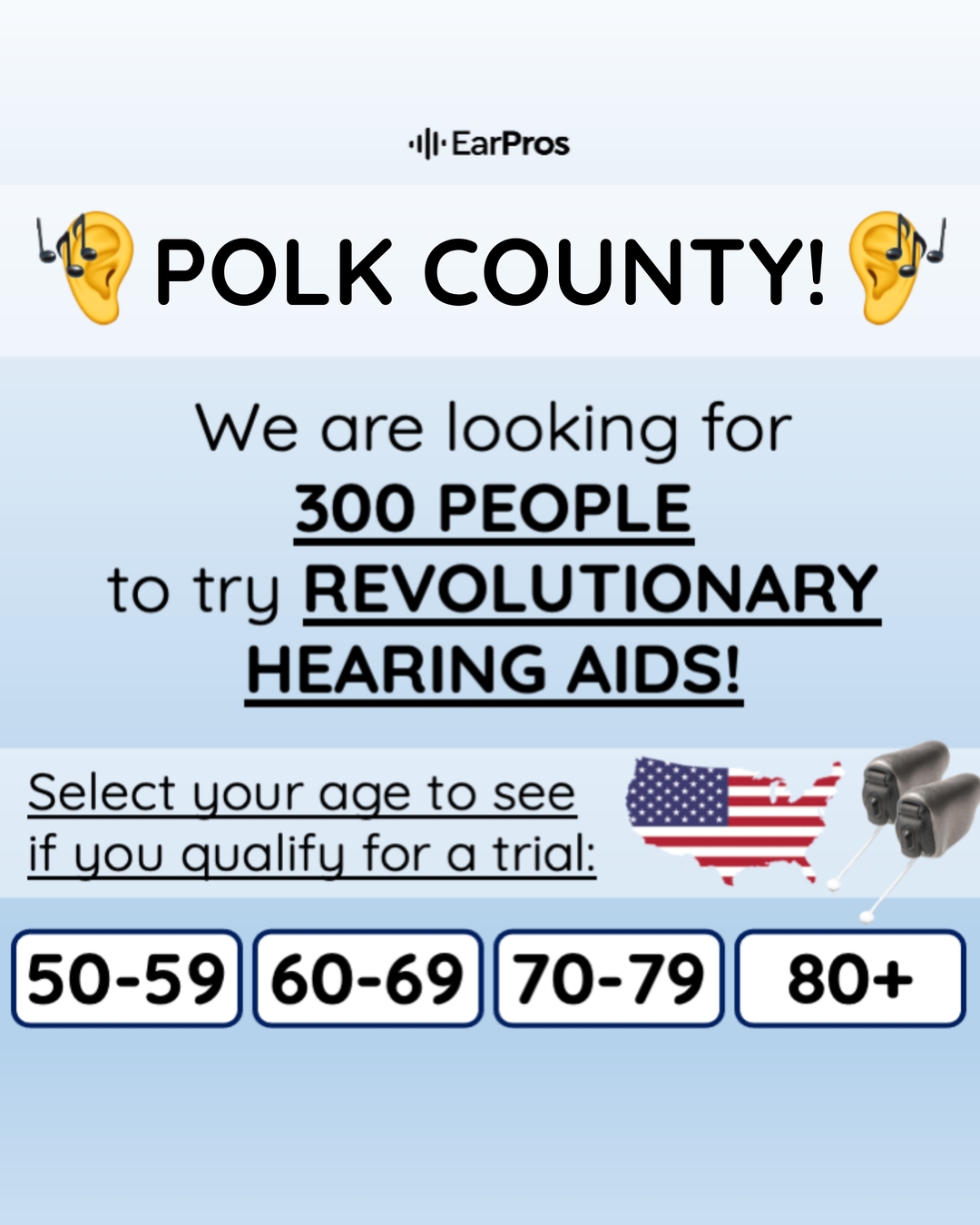 π’ POLK COUNTY! We are looking for 300 People aged 50 or more to try New, Revolutionary Hearing Aids! β Almost Invisible and Discreet β Affordable and Easy to Manage β Perfectly Fit in your Ear β ...