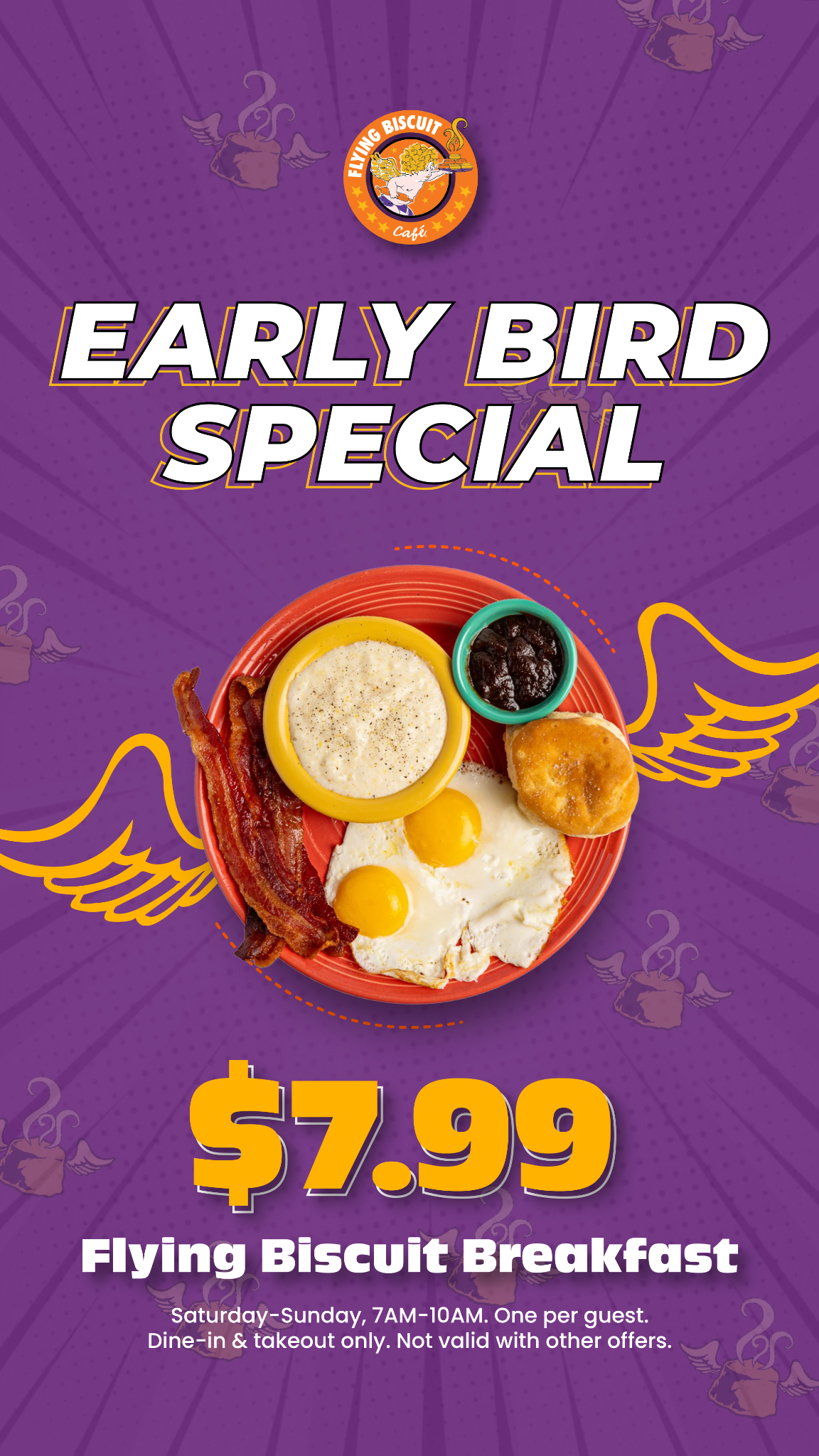 ⏰ Roswell Weekend Early Birds — your breakfast just got better. Our famous Flying Biscuit Breakfast is just $7.99, Saturday–Sunday from 7–10AM. A Southern breakfast worth setting the alarm for....