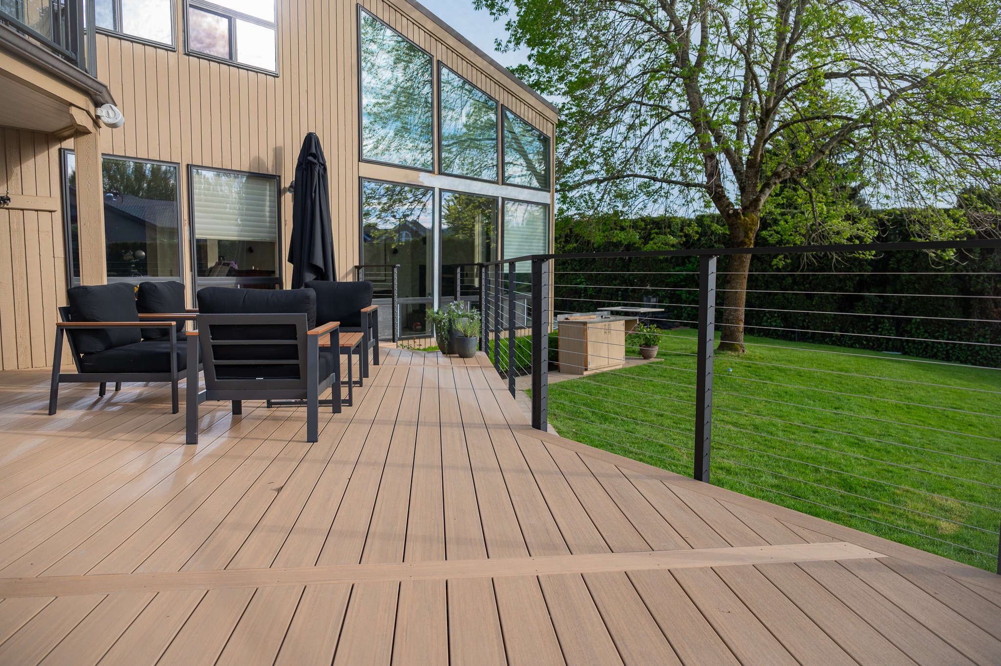 This color combo is so sleek and stunning! We resurfaced this deck with some minor adjustments to layout with TimberTech's Azek Weathered Teak PVC decking paired with Maisy Railing's matte black...