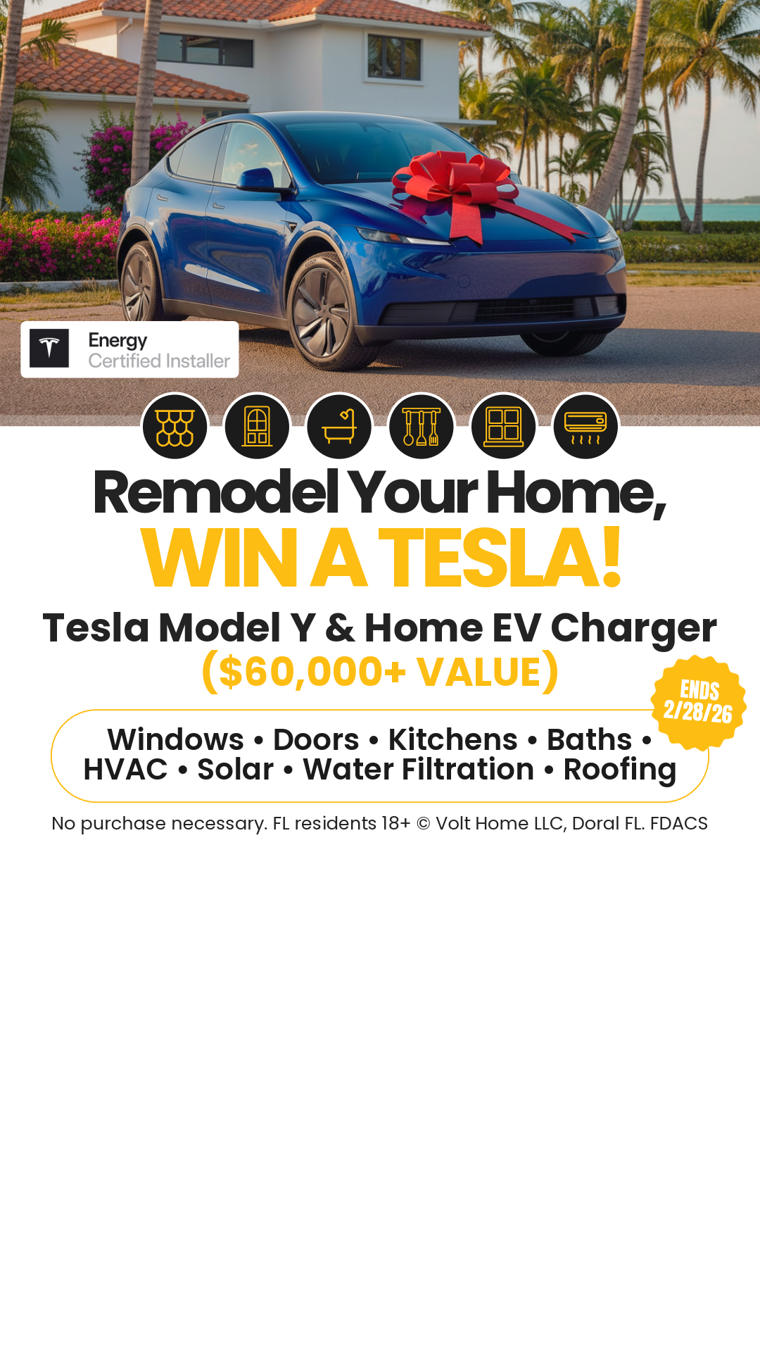 β Remodel Your Home With Us; Win a Tesla Model Y + Charger! π Grand Prize valued at over $60,000 in the Volt Homeβs Dream & Drive Car Giveaway π Bonus entries available with qualifying...