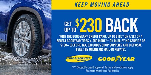 MOVE FORWARD WITH MORE SAVINGS. Get up to $230 back on the purchase of a set of four select Goodyear tires when you use the Goodyear® credit card. Offer’s available April 1st through May 31st. Terms...