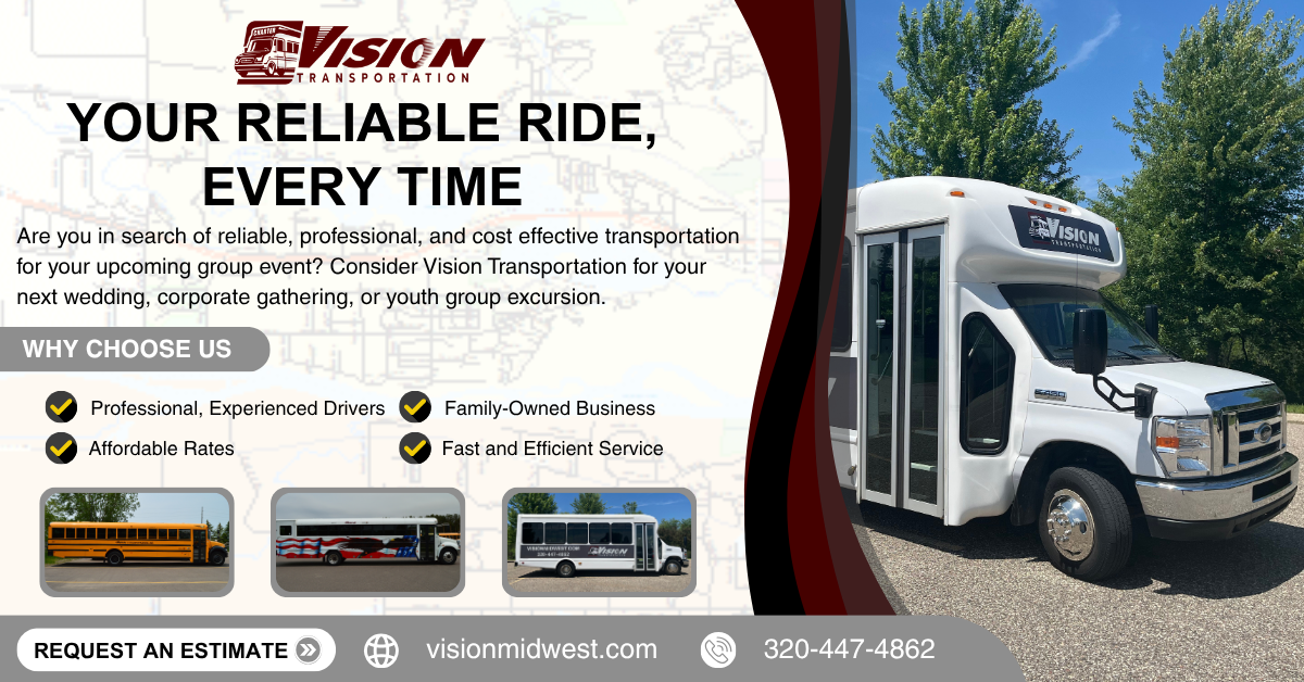 At Vision Transportation we make your group travel easy. Providing professional, reliable and affordable services for weddings, corporate outings, youth groups and more. Contact us for a free...