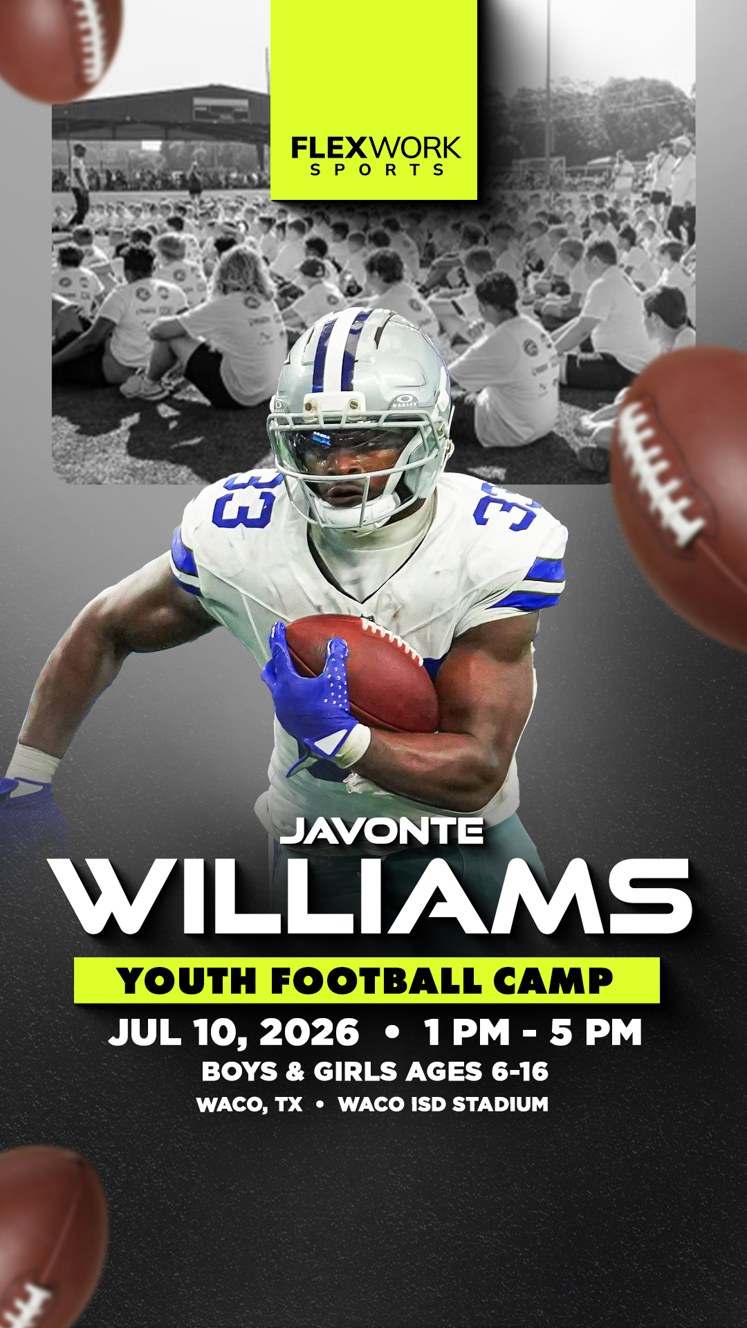Excited to announce Javonte Williams will be in Waco to host a youth Football camp! Athletes ages 6-16 will š Learn skills from Javonte šø Get a pic with the star š Get Swag Join us on Friday,...