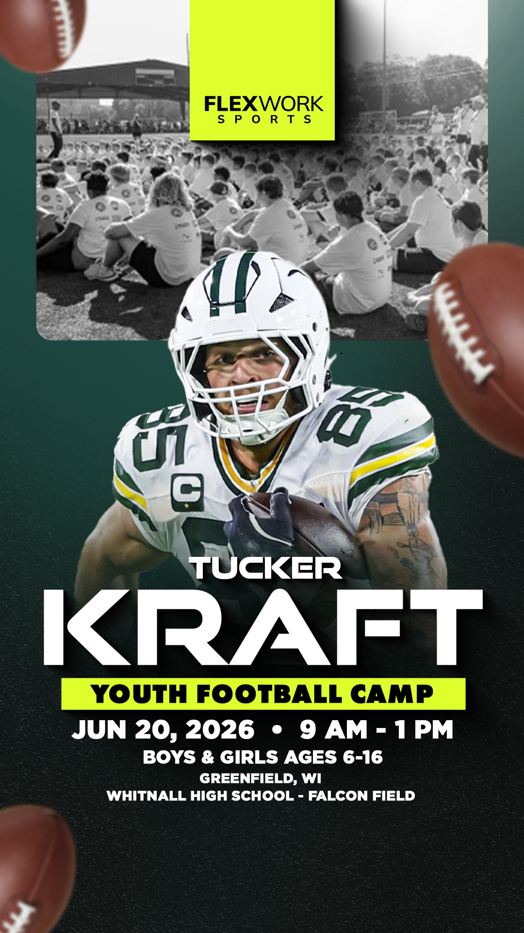 Excited to announce Green Bay tight end Tucker Kraft will be in Greenfield to host a Youth Football Camp! The camp is for athletes ages 6-16 and will take place on Saturday, June 20th at Whitnall...