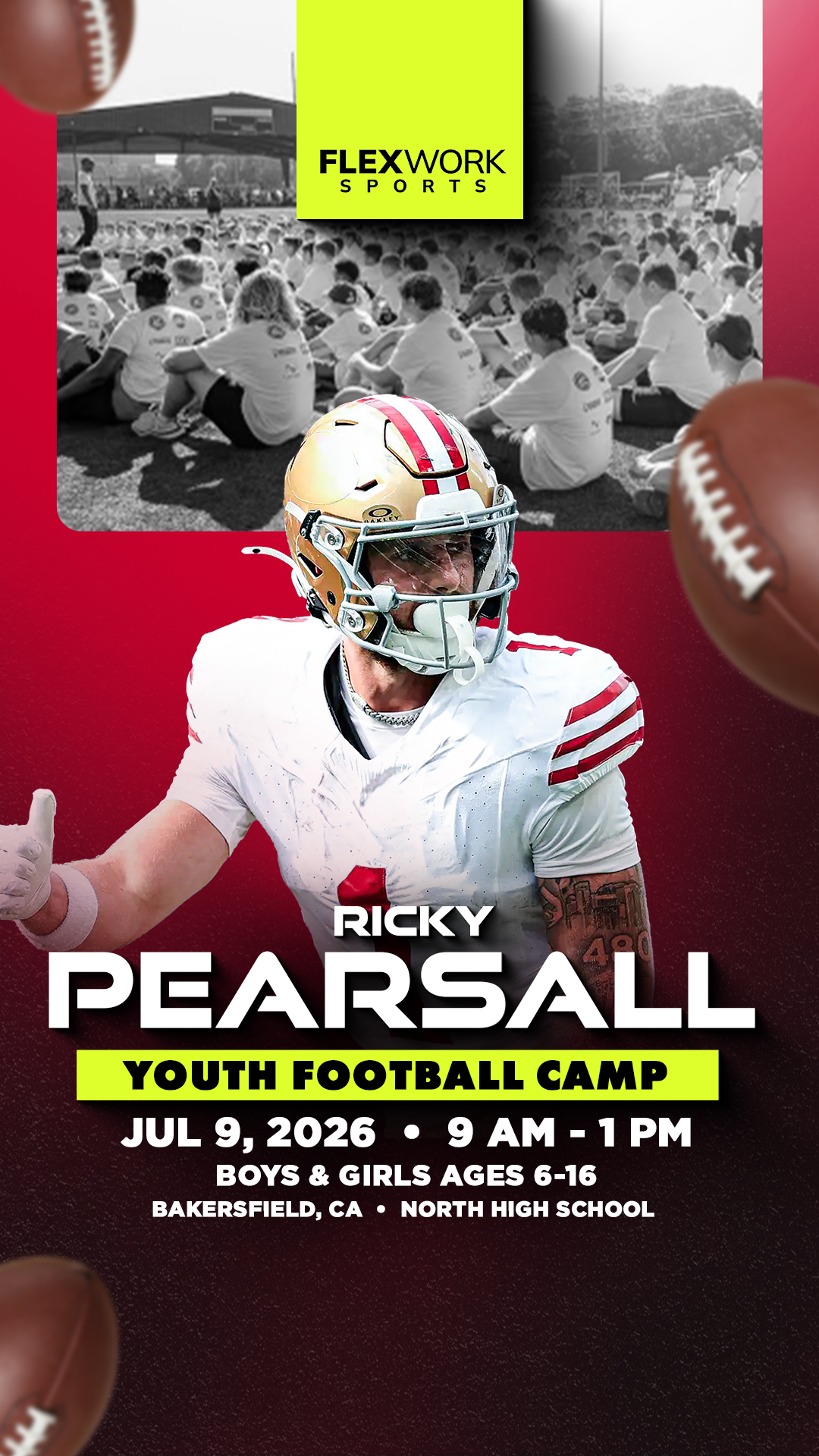 Excited to announce Ricky Pearsall will be in Bakersfield to host a youth Football camp! Athletes ages 6-16 will š Learn skills from Ricky šø Get a pic with the star š Get Swag Join us on...