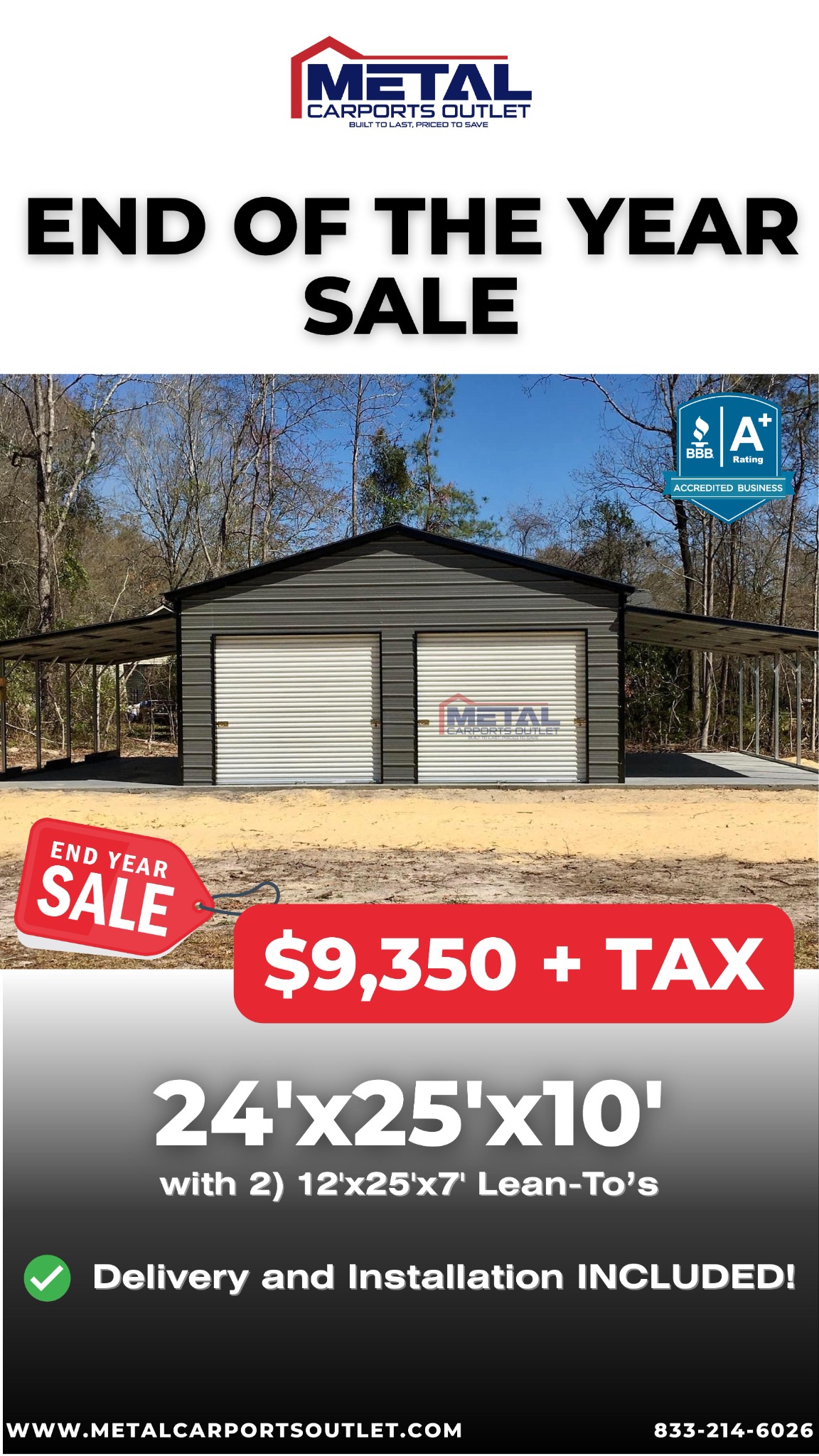 🚨End of Year Blowout SALE🚨 24x25x10 for only $9,350 + tax❗️ ✅ 2) 12x25x7 Lean-To's ✅ 1) Walk-in Door ✅ 2) 10x8 Roll-Up Doors ✅ Delivery and Installation! Act fast and save! Lock in for up to (3)...