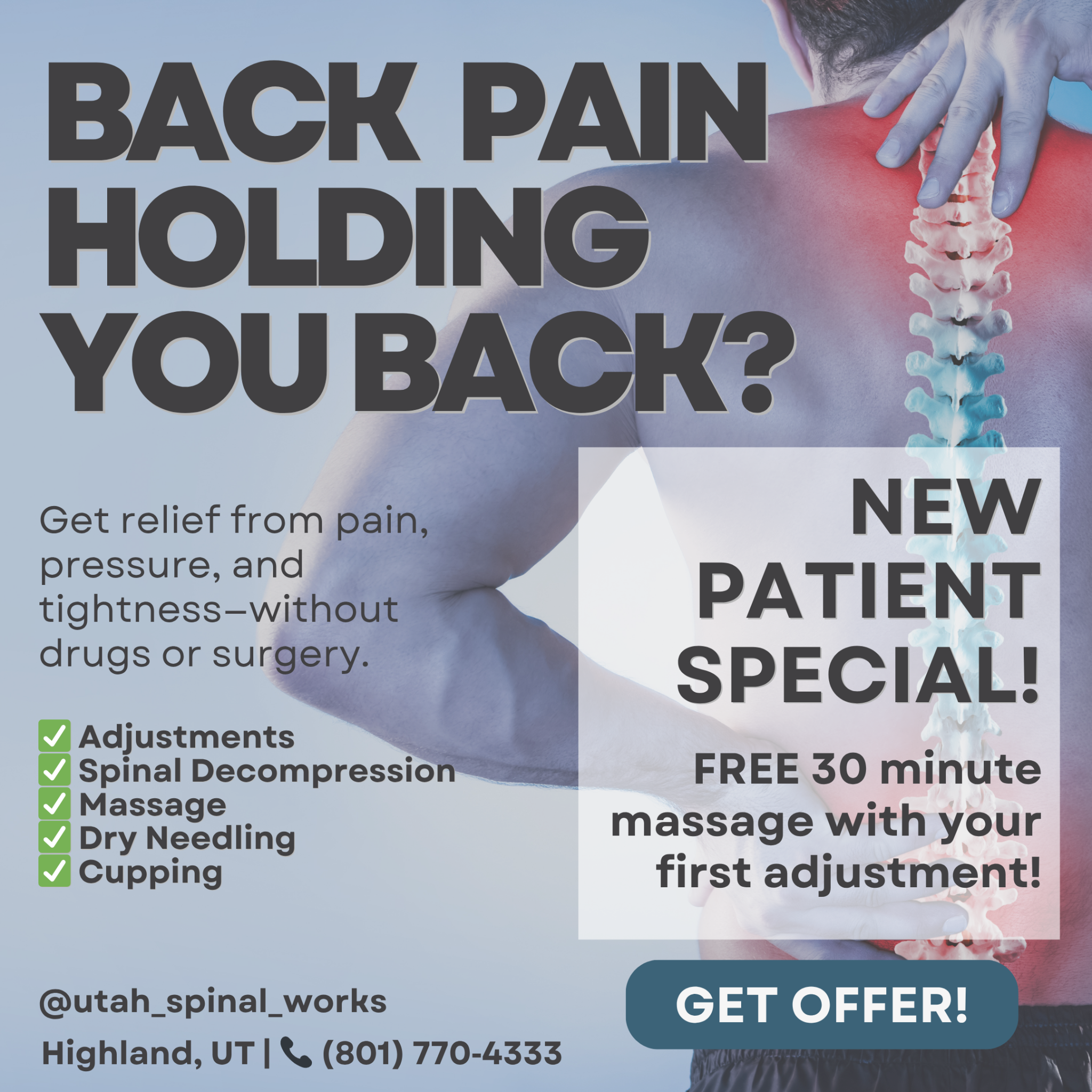 Struggling with back pain, sciatica, or tightness that just won’t go away? At Utah Spinal Works in Highland, we help people just like you feel better—without drugs or surgery. Our advanced...