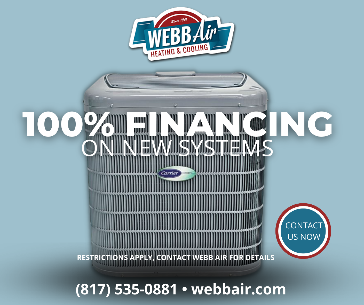 Webb Air a full service Heating , Cooling and Indoor Air Quality business. Call for a FREE new system estimate today: (817) 535 - 0881. And ask us about our flexible FINANCING! Serving Fort Worth...
