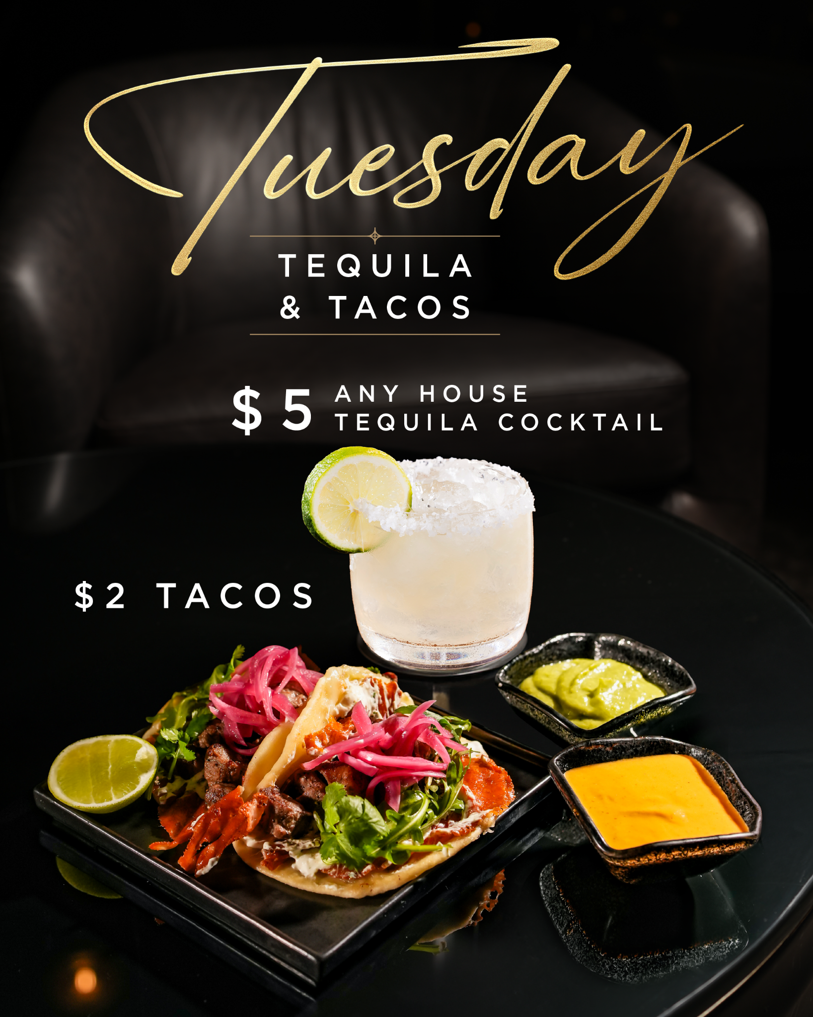 Tuesdays at Bond are a scene straight out of a movie: $5 house tequila cocktails and $2 tacos. A setting of flavor, elegance, and perfect company. Ready for the main act?