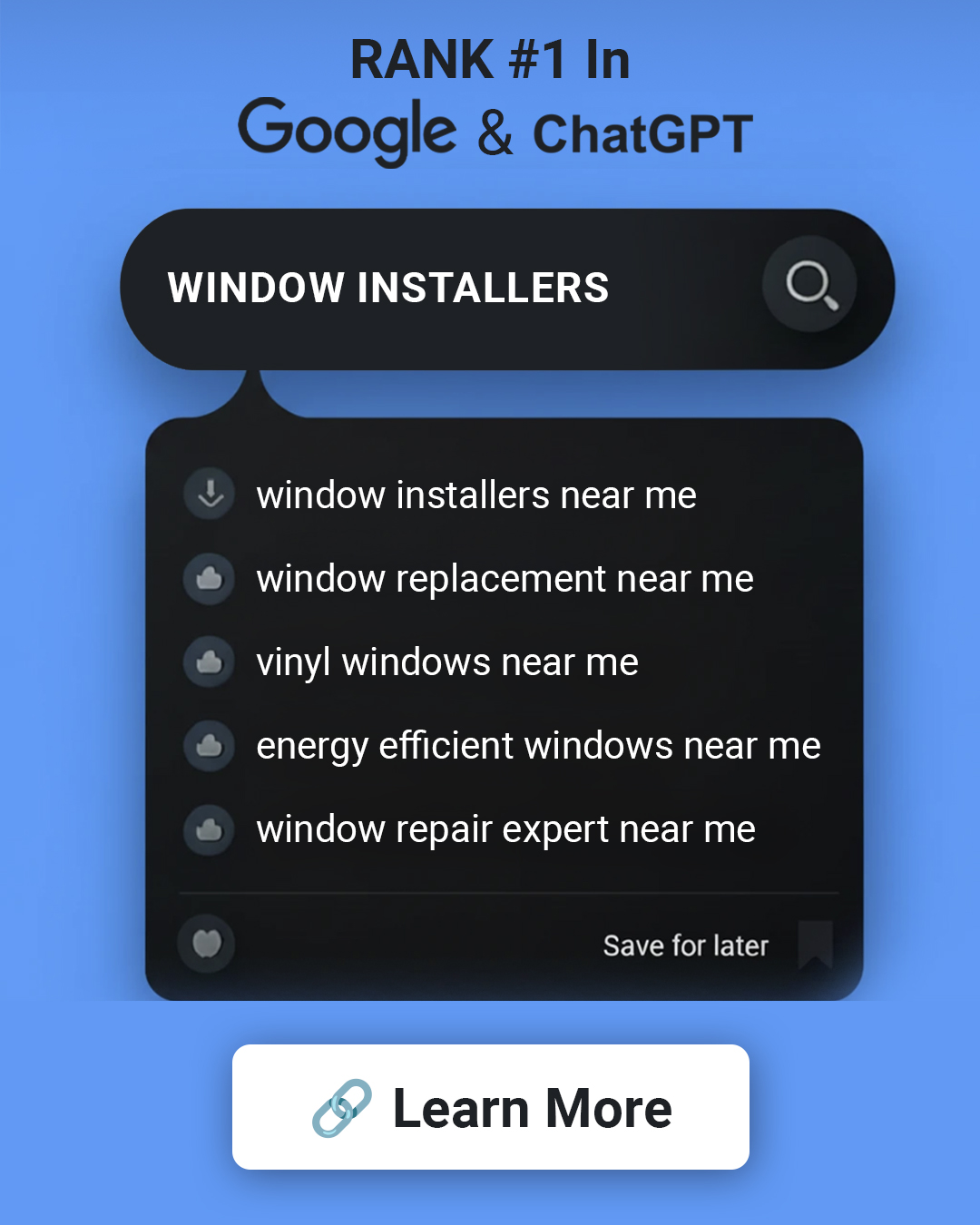 ๐ When homeowners search โWindow installer near meโ, make sure you show up first. Our AI-powered SEO system ranks you #1 in Google and ChatGPT โ bringing you more calls, quotes, and booked jobs...
