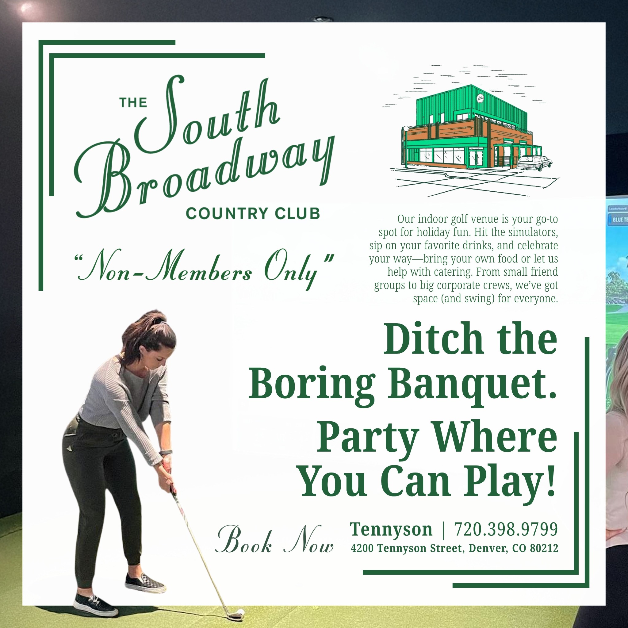 Ditch the Boring Banquet — Party Where You Can Play! Our indoor golf venue is your go-to spot for holiday fun. Book your party with South Broadway Country Club now!