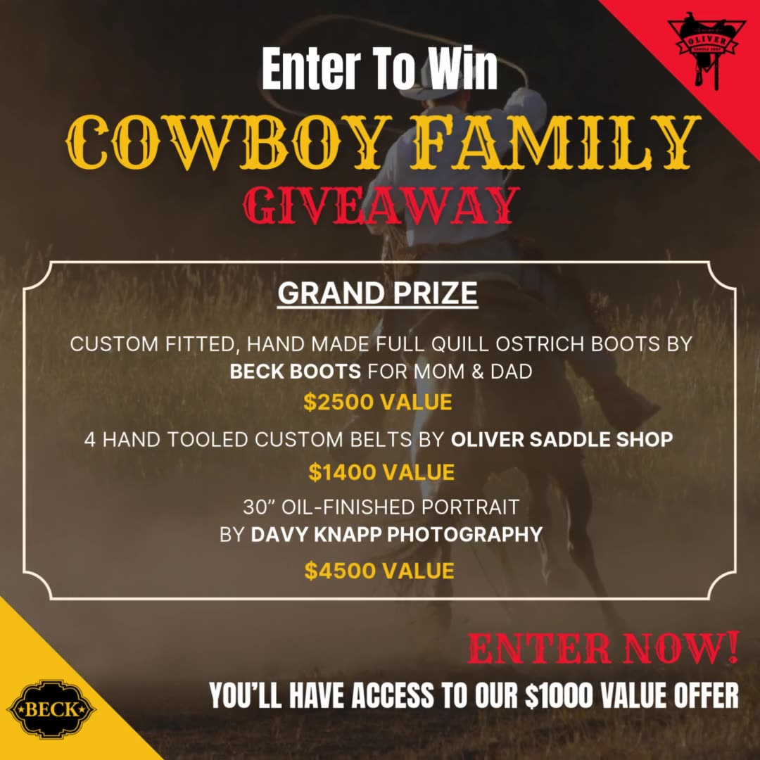 πΊπΈ Win the ULTIMATE Cowboy Package worth $8,400! π€ One Grand Prize Winner, One Second Prize Winner, PLUS Access to our $1000 Offer! π One Grand Prize Winner Will Receive: π’ Custom-Fitted Beck...