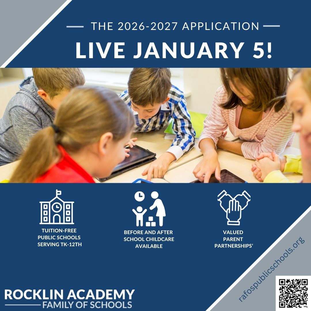 Mark your calendars! The Rocklin Academy Family of Schools enrollment window opens on January 5th! Seats will be available for grades TK-12th at our 4 tuition free schools in Placer and Sacramento...