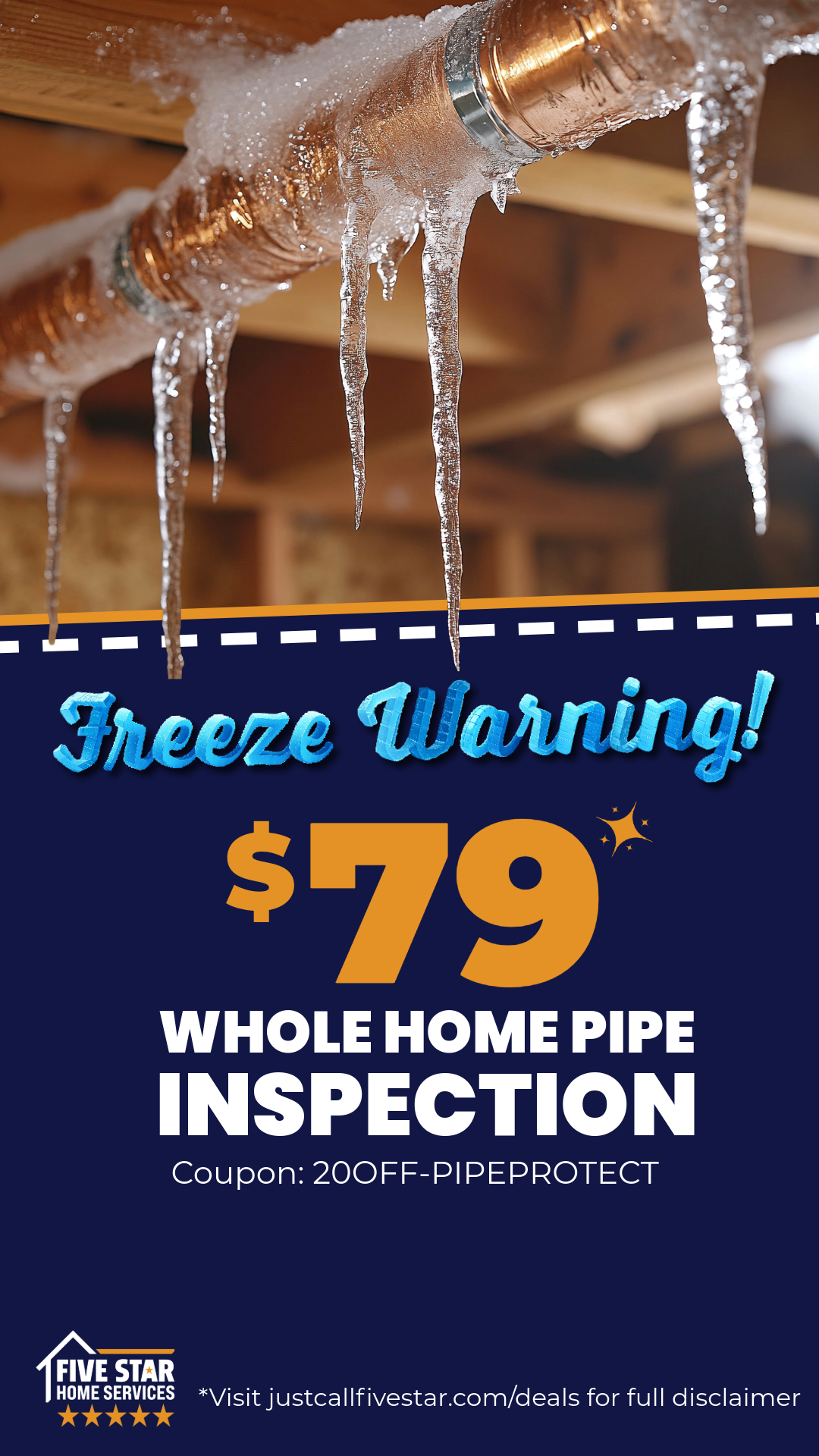 Freezing temps can cause frozen or burst pipes fast. A $79 pipe inspection helps protect your home.