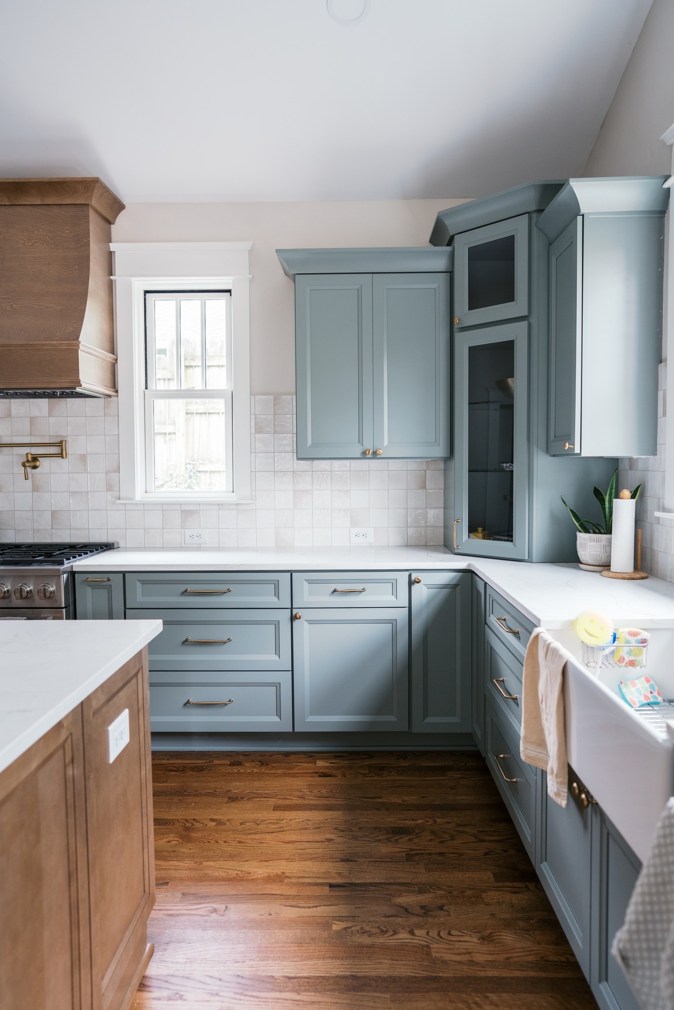 Timeless charm meets modern craftsmanship ✨ This kitchen renovation in Nashville features soothing blue cabinetry, warm wood accents, handmade-style tile, and brass details that bring the whole space...