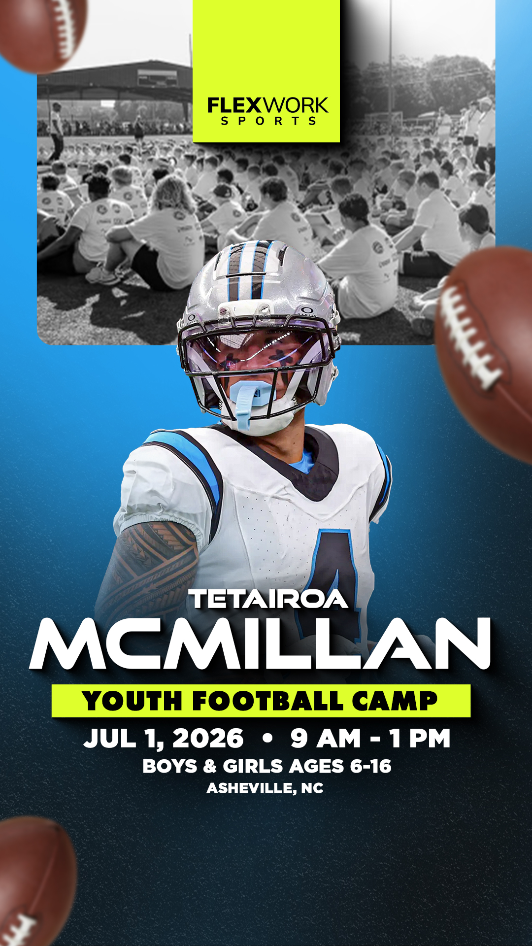 Excited to announce Tetairoa McMillan will be in Asheville to host a youth Football camp! Athletes ages 6-16 will š Learn skills from Tetairoa šø Get a pic with the star š Get Swag Join us on...