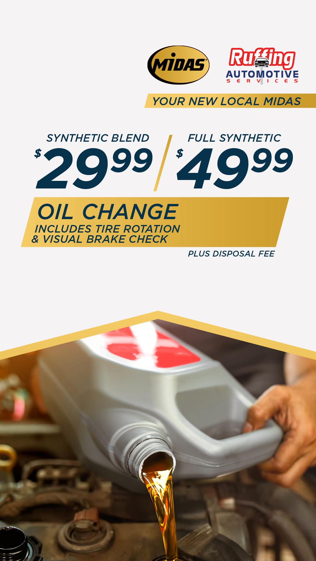 Visit your new local Midas for a $29.99 Synthetic Blend Oil Change Grand Opening Special.