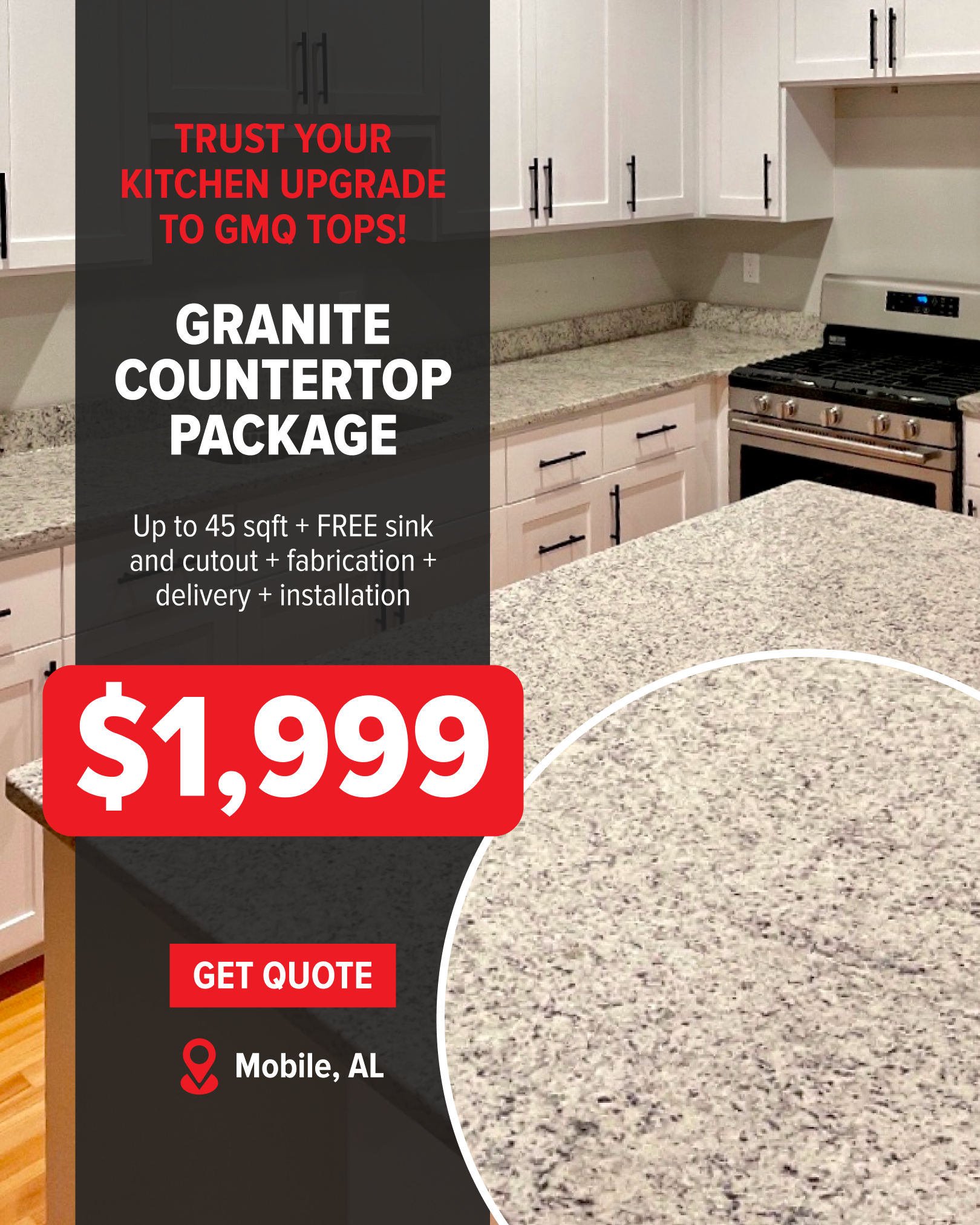 For the residents of Mobile, AL: Granite Countertop Package for $1,999! Choose from the stunning colors* and get up to 45 sqft with a FREE sink❗️ FREE sink and cutout, fabrication, delivery and...