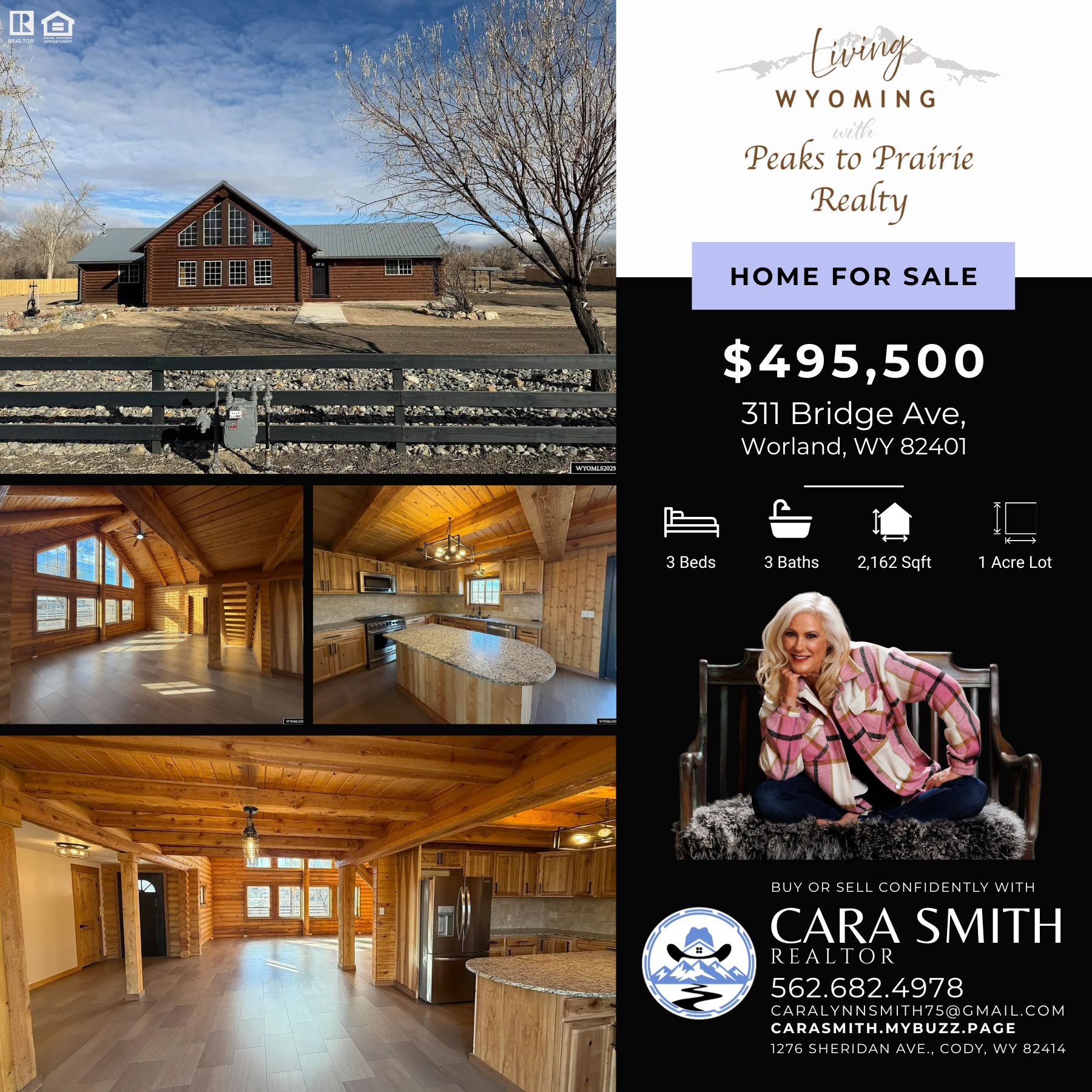 This newly finished log cabin on one acre near the Big Horn River in Worland, WY offers the perfect blend of rustic charm and modern comfort. Featuring three bedrooms, two bathrooms, and a loft,...