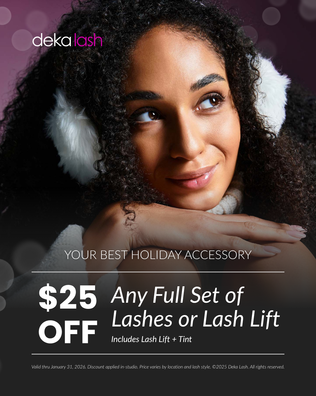 Save Big on Holiday Glam. πŸ₯‚ Get $25 off any full set of lash extensions, lift, or lift + tint. Effortless beauty for every party. Spots fill fastβ€”book now!