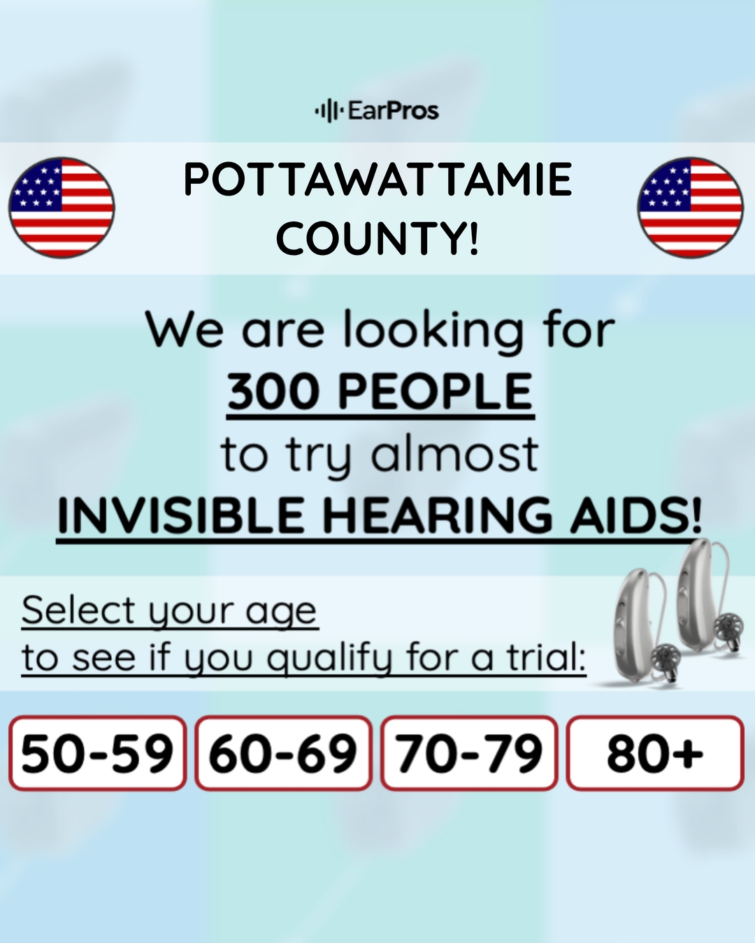 π’ POTTAWATTAMIE COUNTY! We are looking for 300 People aged 50 or more to try New, Revolutionary Hearing Aids! β Almost Invisible and Discreet β Affordable and Easy to Manage β Perfectly Fit in your...