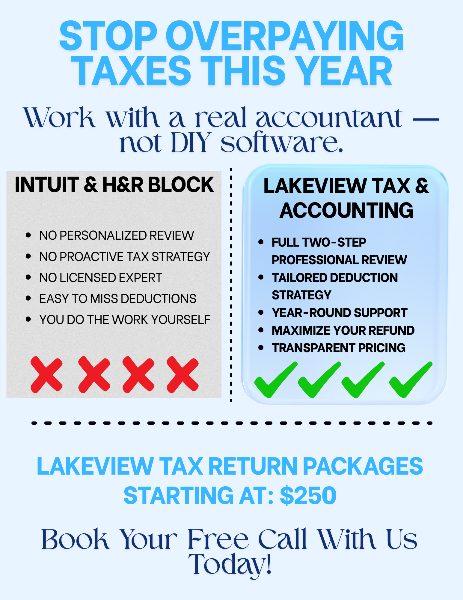 Intuit & H&R Block might file your return, well.. We optimize it. Professional tax return packages start at $250 with a full two-step review, tailored strategy, and year-round support. Book your free...