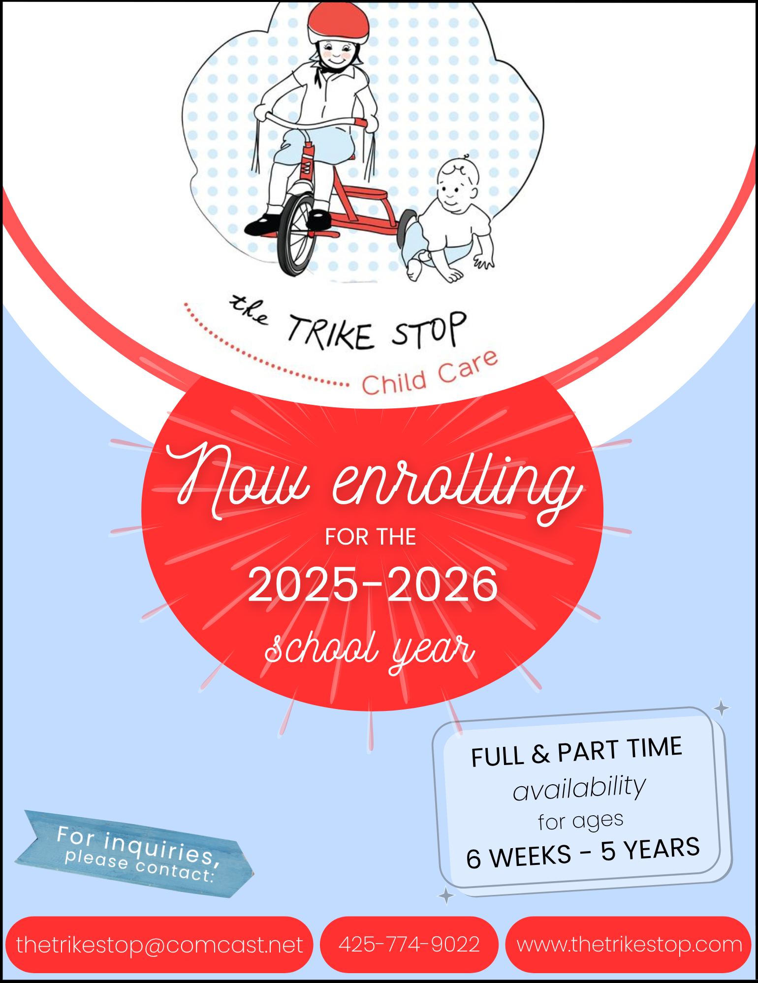 Now enrolling! Our availability can be viewed here: https://www.kinside.com/childcare/wa/edmonds/the-trike-stop.