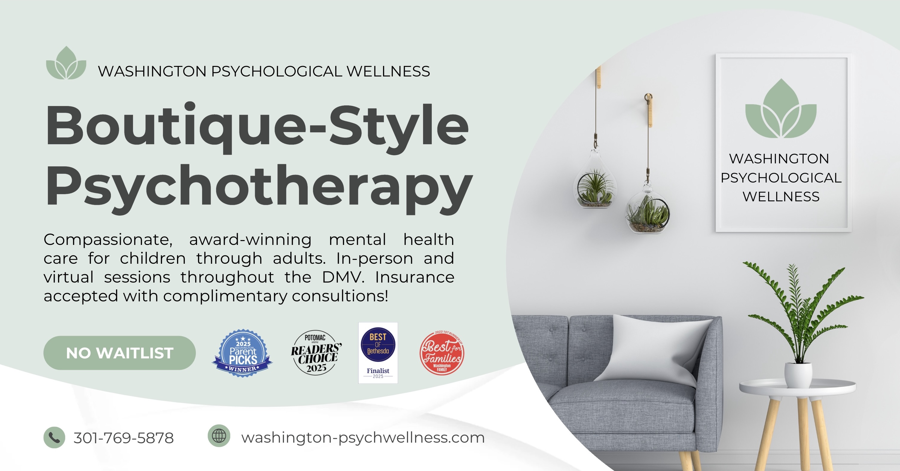 Boutique-style psychotherapy for all ages. 💚 Rockville, Gaithersburg, and virtual in MD, VA, DC. Insurance accepted. No waitlist. 🌿 Complimentary 15-minute consults!
