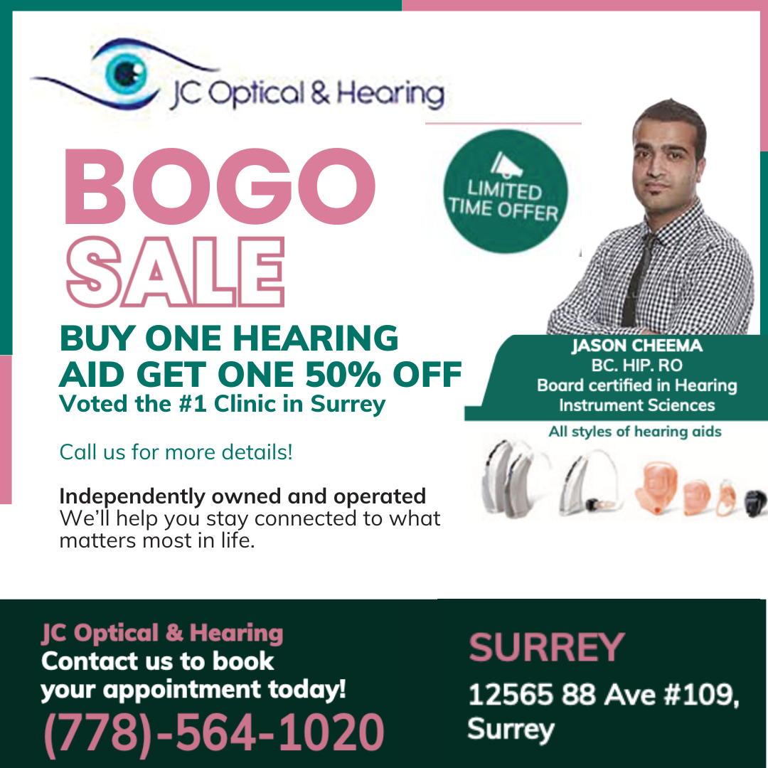 π₯ BOGO Sale! π₯ Buy One Hearing Aid, Get One 50% OFF! Take advantage of this limited-time offer at JC OPTICAL & HEARING π Call us for more details: 778-564-1020