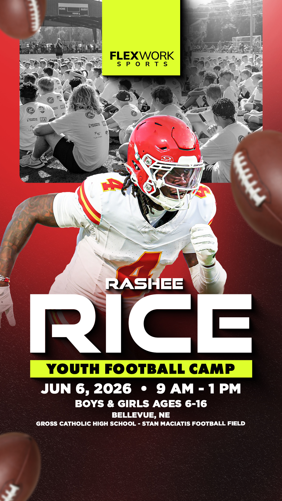 Excited to announce Kansas City wide receiver Rashee Rice will be in Bellevue to host a Youth Football Camp! The camp is for boys & girls ages 6-16 and will take place on Saturday, June 6th at Gross...