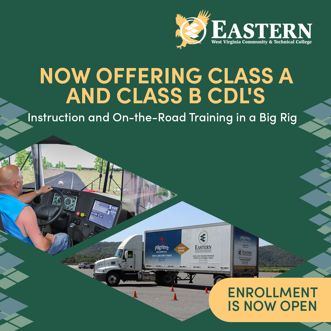 Start a CDL career with training at Eastern WVCTC. Sign up for Class A or Class B courses. Enroll today! Affordable tuition, flexible classes, and real-world training to get you job-ready fast.