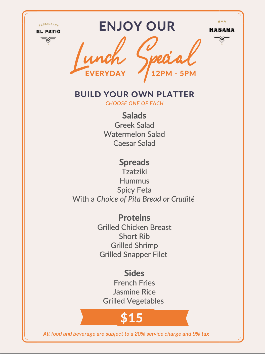 Build your perfect lunch plate with fresh salads, spreads, proteins, and sides. Enjoy our $15 Lunch Special every day from 12PM–5PM.