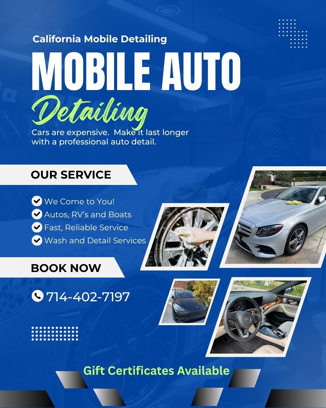 Tired of driving around with a dirty car? We've got you covered! Professional mobile detailing and pressure washing services in Orange County, CA. Schedule yours today: 714/402-7197